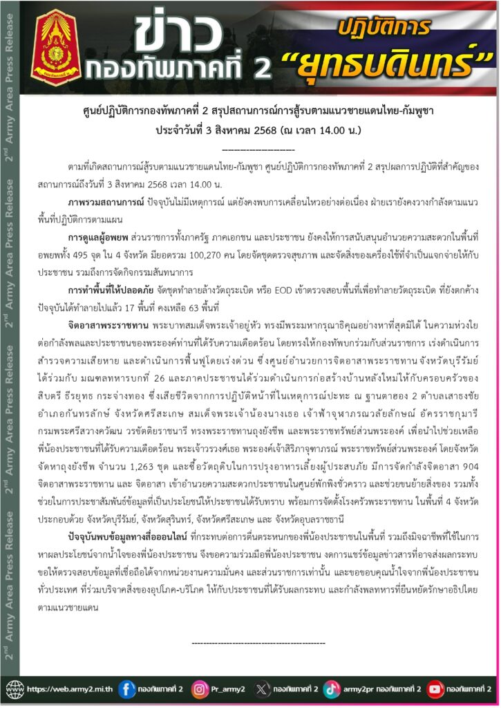 กองทัพภาคที่ 2 สรุปสถานการณ์การสู้รบตามแนวชายแดนไทย-กัมพูชา วันที่ 3 สิงหาคม 2568 (ณ เวลา 14.00 น.)