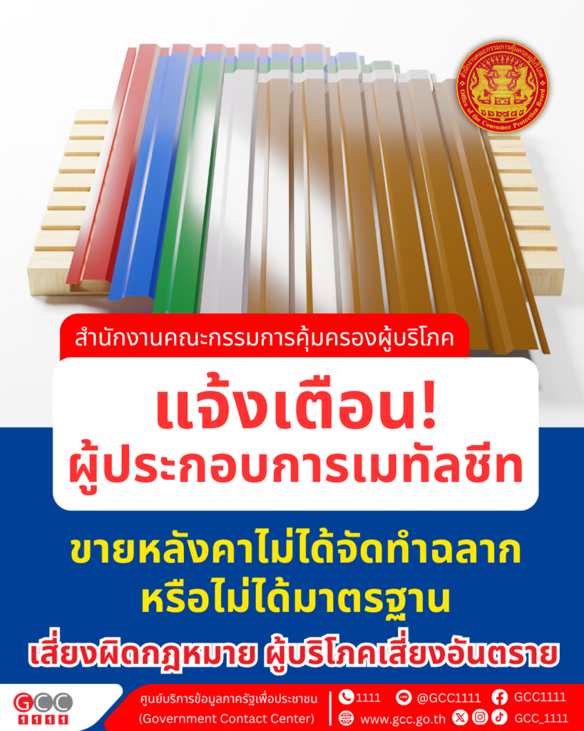 สำนักงานคณะกรรมการคุ้มครองผู้บริโภค แจ้งเตือนผู้ประกอบธุรกิจจำหน่ายหลังคา เมทัลชีท (Metal Sheet) ทั้งแบบเคลือบสีและไม่เคลือบสีทั่วประเทศ ให้เร่งดำเนินการให้ถูกต้องตามประกาศ