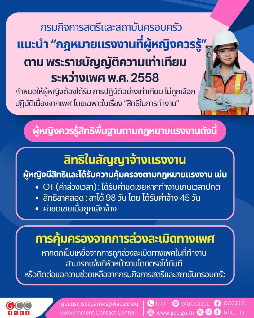 กรมกิจการสตรีและสถาบันครอบครัว แนะนำ กฎหมายแรงงานที่ผู้หญิงควรรู้ ตาม พระราชบัญญัติความเท่าเทียมระหว่างเพศ พ.ศ. 2558 กำหนดให้ผู้หญิงต้อง ได้รับการปฏิบัติอย่างเท่าเทียม ไม่ถูกเลือกปฏิบัติเนื่องจากเพศ โดยเฉพาะในเรื่องการทำงาน