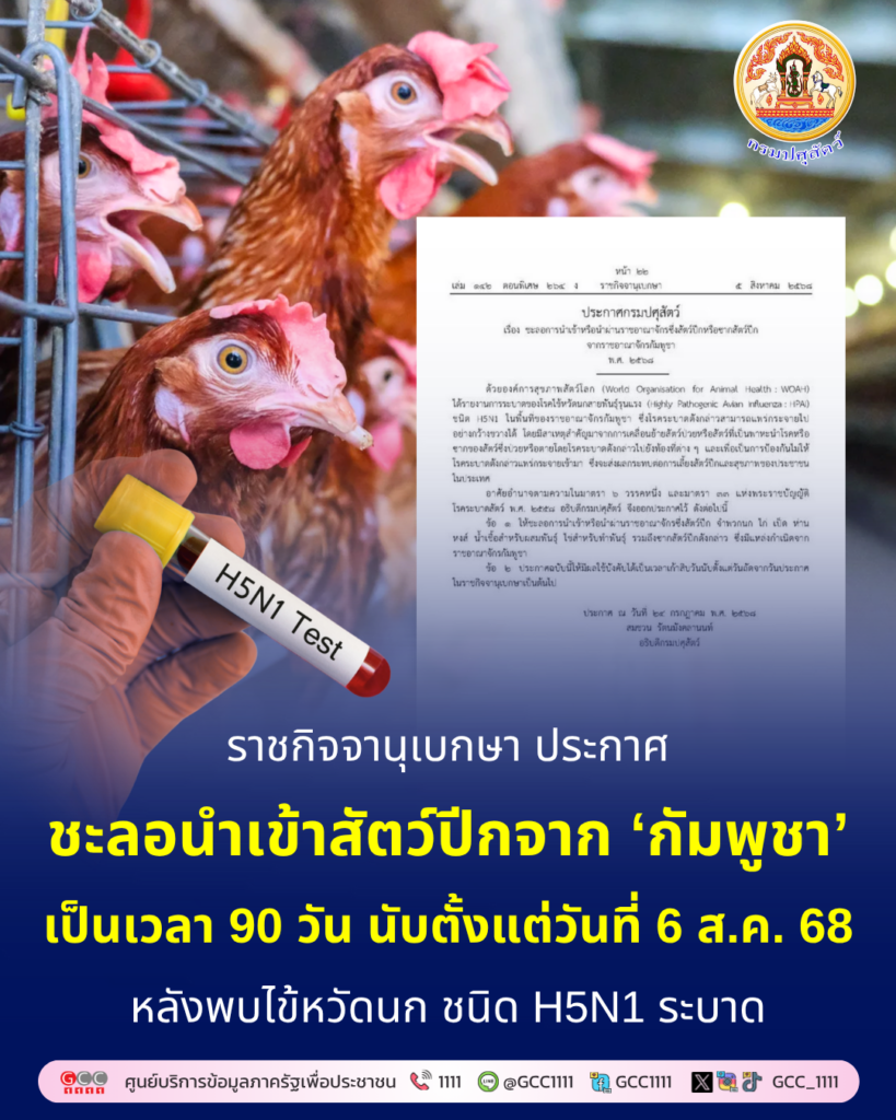 ราชกิจจานุเบกษา เผยแพร่ ประกาศกรมปศุสัตว์ เรื่องชะลอการนำเข้าและนำผ่านสัตว์ปีกหรือซากสัตว์ปีกจากราชอาณาจักรกัมพูชา เป็นเวลา 90 วัน ตั้งแต่วันที่ 6 สิงหาคม 2568 เพื่อป้องกันการแพร่ระบาดของโรคไข้หวัดนกชนิด H5N1 หลังองค์การสุขภาพสัตว์โลกรายงานการระบาดในกัมพูชา โดยประกาศครอบคลุมสัตว์ปีกทุกชนิด รวมถึงน้ำเชื้อและไข่สำหรับทำพันธุ์
