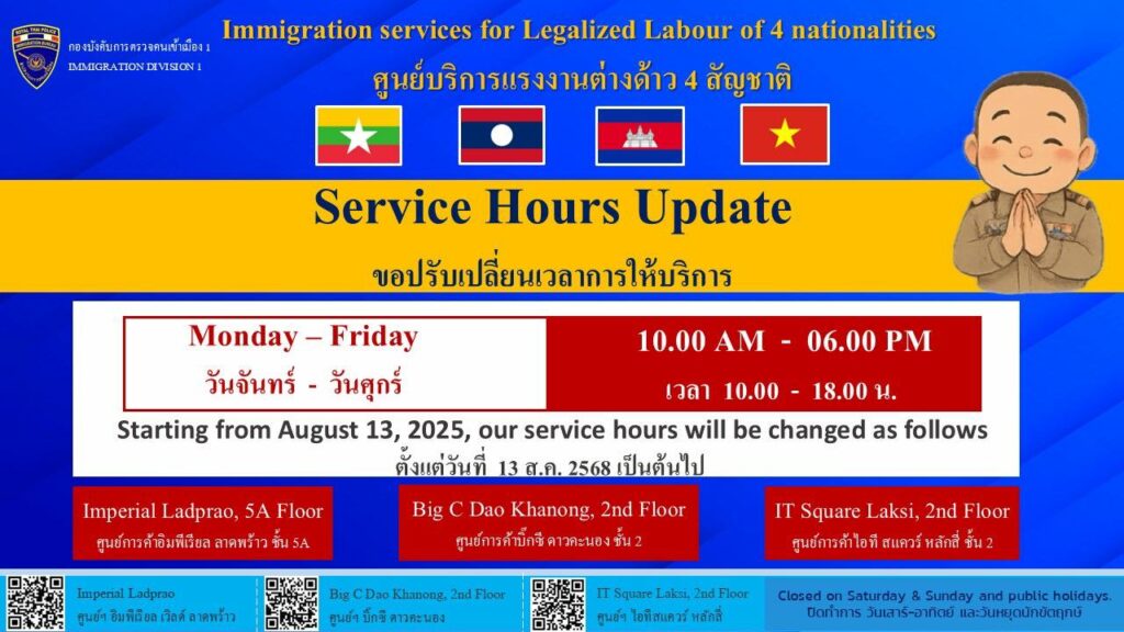 กองบังคับการตรวจคนเข้าเมือง 1 แจ้งปรับเปลี่ยนเวลาให้บริการศูนย์บริการแรงงานต่างด้าว 4 สัญชาติ ข่าวสารกิจกรรม กองบังคับการตรวจคนเข้าเมือง 1 แจ้งปรับเปลี่ยนเวลาให้บริการศูนย์บริการแรงงานต่างด้าว 4 สัญชาติ กองบังคับการตรวจคนเข้าเมือง 1 แจ้งปรับเปลี่ยนเวลาให้บริการศูนย์บริการแรงงานต่างด้าว 4 สัญชาติศูนย์บริการแรงงานต่างด้าว 4 สัญชาติศูนย์การค้าอิมพีเรียลลาดพร้าวศูนย์การค้าบิ๊กซีดาวคะนองศูนย์การค้าไอทีสแควร์หลักสี่ วันจันทร์ – วันศุกร์ ให้บริการตั้งแต่เวลา 10.00 – 18.00 น. เริ่มตั้งแต่วันที่ 13 สิงหาคม 2568 เป็นต้นไป ที่มา : Facebook Bangkok Immigration-กองบังคับการตรวจคนเข้าเมือง 1-กรุงเทพฯ Post Views: 33 FacebookFacebookXTwitterLINELine