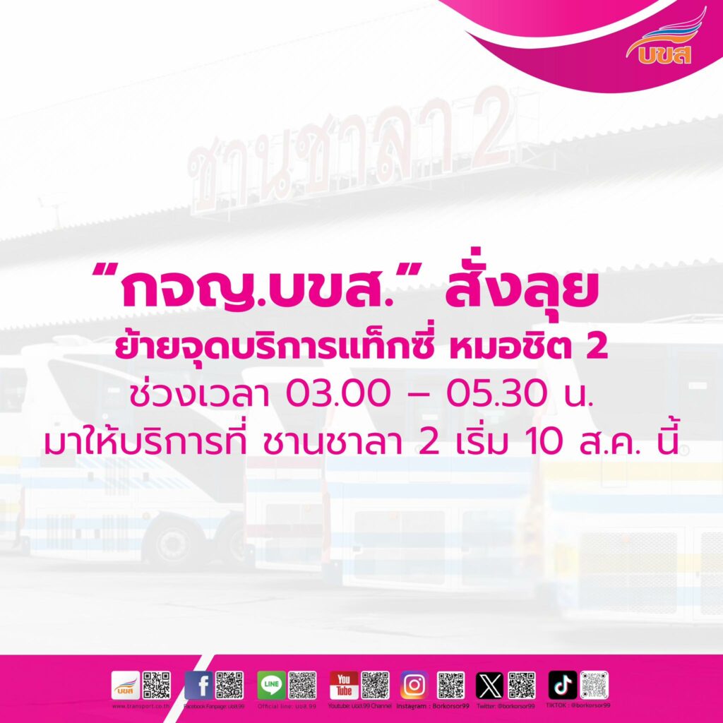 บขส. ปรับย้ายจุดบริการแท็กซี่ หมอชิต 2 ช่วงเวลา 03.00 – 06.00 น. มาให้บริการที่ ชานชาลา 2 เริ่ม 11 ส.ค. 68