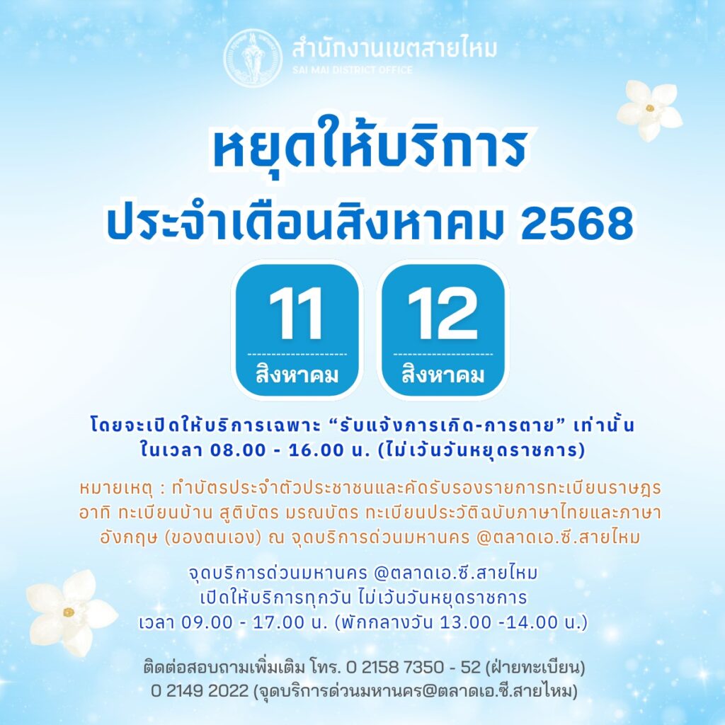 สำนักงานเขตสายไหม แจ้งหยุดให้บริการประจำเดือนสิงหาคม 2568