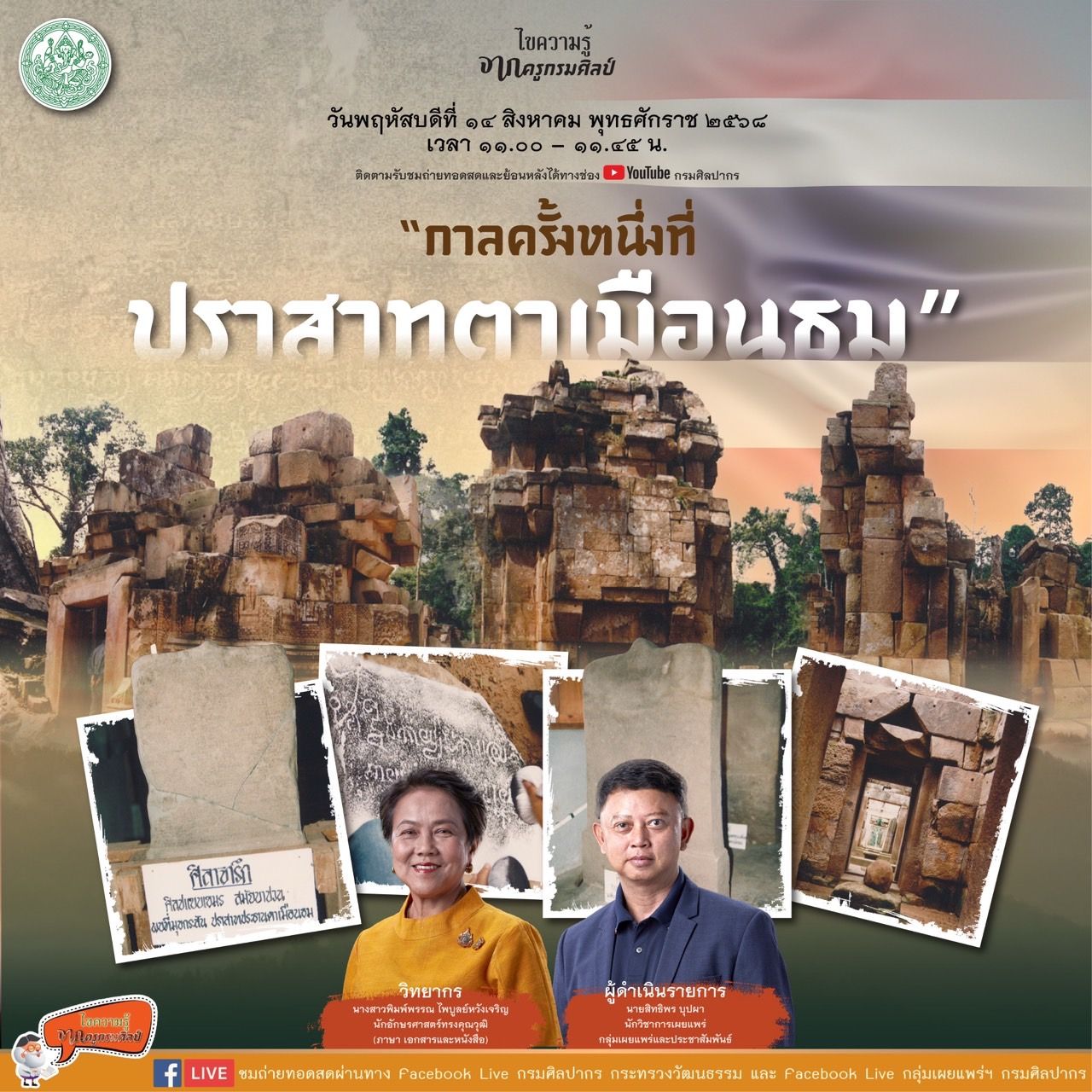 กรมศิลปากร ขอเชิญรับชมการถ่ายทอดสด Facebook Live รายการไขความรู้จากครูกรมศิลป์ ตอน ตอน กาลครั้งหนึ่งที่ปราสาทตาเมือนธม ในวันที่ 14 สิงหาคม 2568 เวลา 11.00 – 11.45 น. สามารถติดตามชมได้ทาง Facebook Live : กรมศิลปากร กระทรวงวัฒนธรรม และ Facebook Live : กลุ่มเผยแพร่ฯ กรมศิลปากร