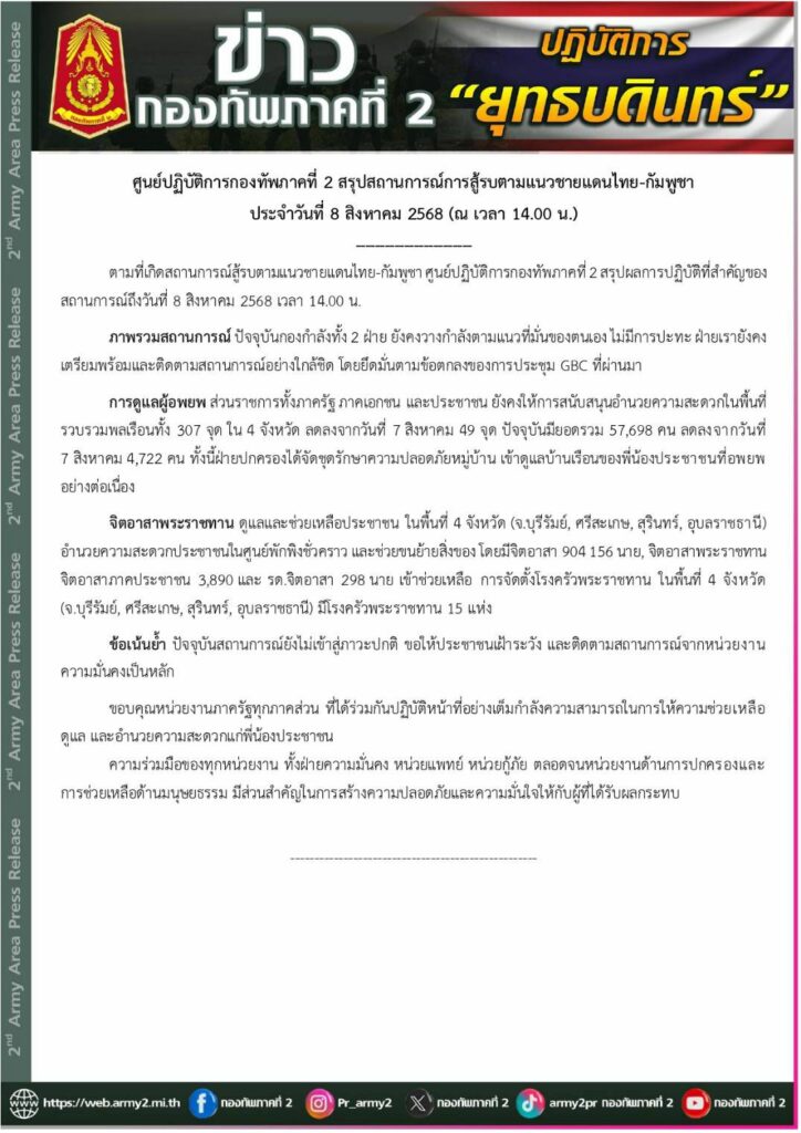 กองทัพภาคที่ 2 สรุปสถานการณ์การสู้รบตามแนวชายแดนไทย-กัมพูชา วันที่ 8 สิงหาคม 2568 (ณ เวลา 14.00 น.)