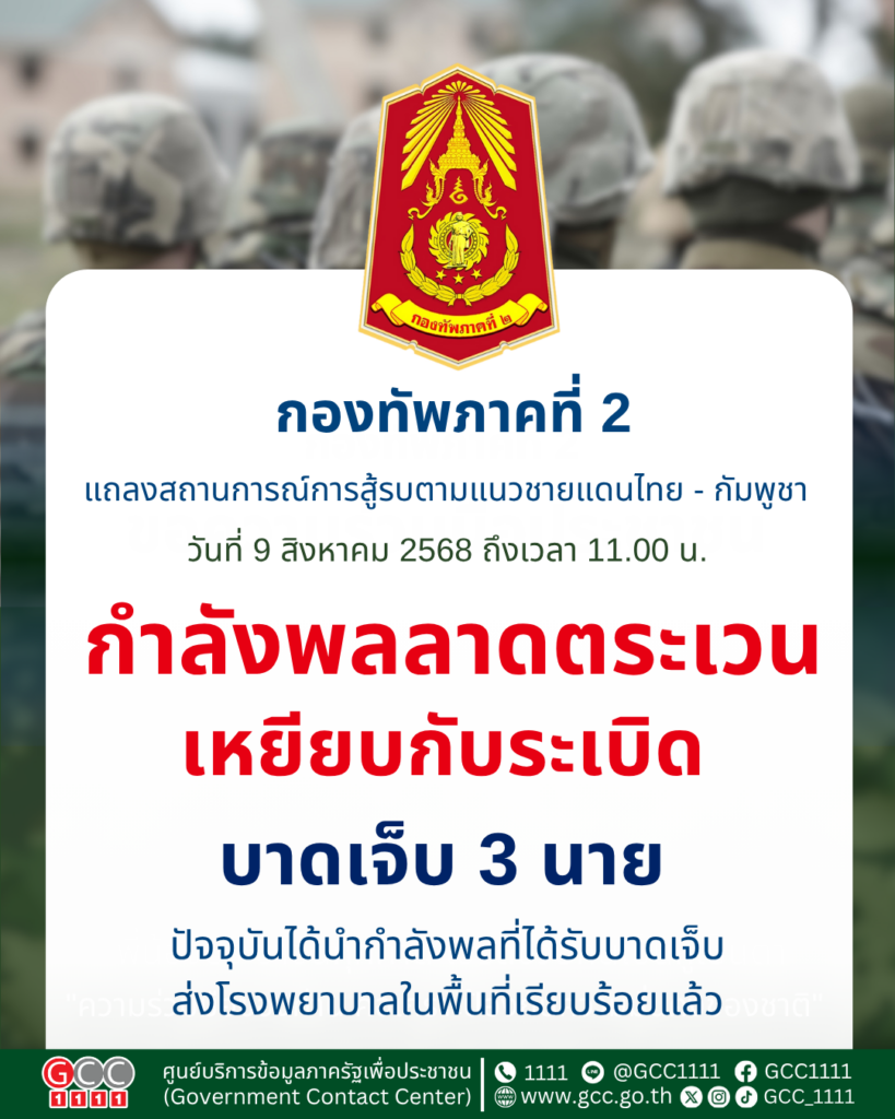 ศูนย์ปฏิบัติการกองทัพภาคที่ 2 ขอแถลงสถานการณ์การตามแนวชายแดนไทย – กัมพูชา ประจำวันที่วันที่ 9 สิงหาคม 2568 ถึงเวลา 11.00 น.