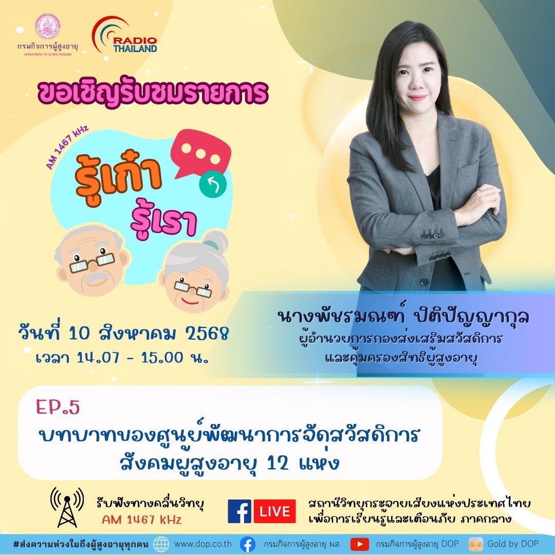 ขอเชิญรับชมรายการ รู้เก๋า รู้เรา ประเด็น บทบาทของศูนย์พัฒนาการจัดสวัสดิการสังคมผู้สูงอายุ 12 เเห่ง วันอาทิตย์ที่ 10 สิงหาคม 2568 เวลา 14.07 – 15.00 น. ให้สัมภาษณ์ โดย นางพัชรมณฑ์ ปิติปัญญากุล ผู้อำนวยการกองส่งเสริมสวัสดิการเเละคุ้มครองสิทธิผู้สูงอายุ ดำเนินรายการ โดย คุณพนาวรรณ์ จิตรสมุทร ออกอากาศทาง : สถานีวิทยุกระจายเสียงแห่งประเทศไทยเพื่อการเรียนรู้และเตือนภัย ภาคกลาง AM 1467kHz https://share.google/QRC9d4jgUQ2V9t4EX เเละเฟสบุ๊คสถานีวิทยุกระจายเสียงแห่งประเทศไทยเพื่อการเรียนรู้และเตือนภัย ภาคกลาง https://www.facebook.com/share/1AennYMGnX/