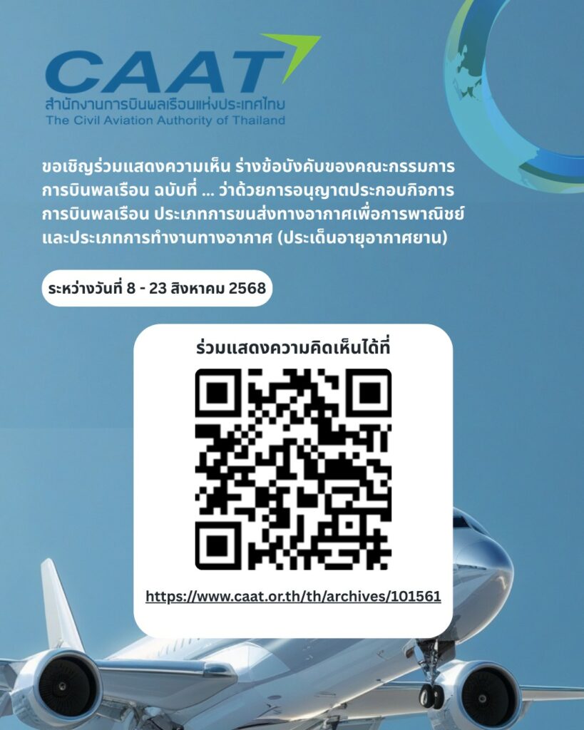 สำนักงานการบินพลเรือนแห่งประเทศไทย เปิดรับฟังความเห็นร่าง ข้อบังคับของคณะกรรมการการบินพลเรือน ฉบับที่ … ว่าด้วยการอนุญาตประกอบกิจการการบินพลเรือน ประเภทการขนส่งทางอากาศเพื่อการพาณิชย์ และประเภทการทำงานทางอากาศ (ประเด็นอายุอากาศยาน) เพื่อประกอบการพิจารณาปรับปรุงหลักเกณฑ์ดังกล่าวให้มีความเหมาะสมและมีประสิทธิภาพมากยิ่งขึ้น ระหว่างวันที่ 8-23 สิงหาคม 2568