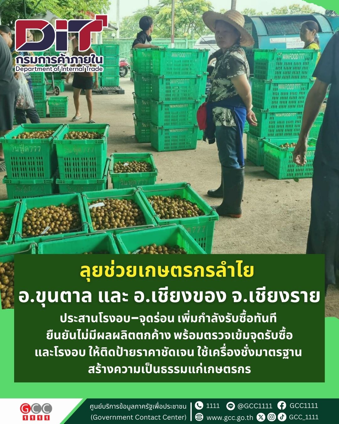 DIT กรมการค้าภายใน ลุยแก้ปัญหาให้กับเกษตรกรผู้ปลูกลำไย ในพื้นที่ อ.ขุนตาล และ อ.เชียงของ หลังหยุดยาว เกษตรกรเก็บผลผลิตเพิ่ม และล้งรับซื้อไม่ทัน ดึงโรงอบ จุดร่อน เข้าไปช่วยดูแลทันที ยืนยันไม่มีผลผลิตตกค้าง ยันเดินหน้าดูแลต่อเนื่องจนจบฤดูกาล ส่วนราคาล่าสุดเกรด AA ขยับขึ้นเป็นกิโลกรัมละ 8-12 บาทแล้ว ลุยตรวจจุดรับซื้อ เครื่องชั่ง เครื่องร่อน สร้างความเป็นธรรมให้เกษตรกร