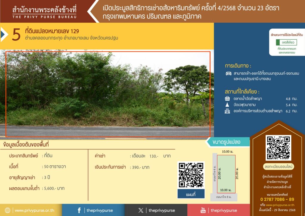 สำนักงานพระคลังข้างที่ เปิดประมูลสิทธิการเช่า 3 ปี ที่ดินแปลงหมายเลข 129 ค่าเช่าเริ่มต้นที่ 130.- บาท/เดือน