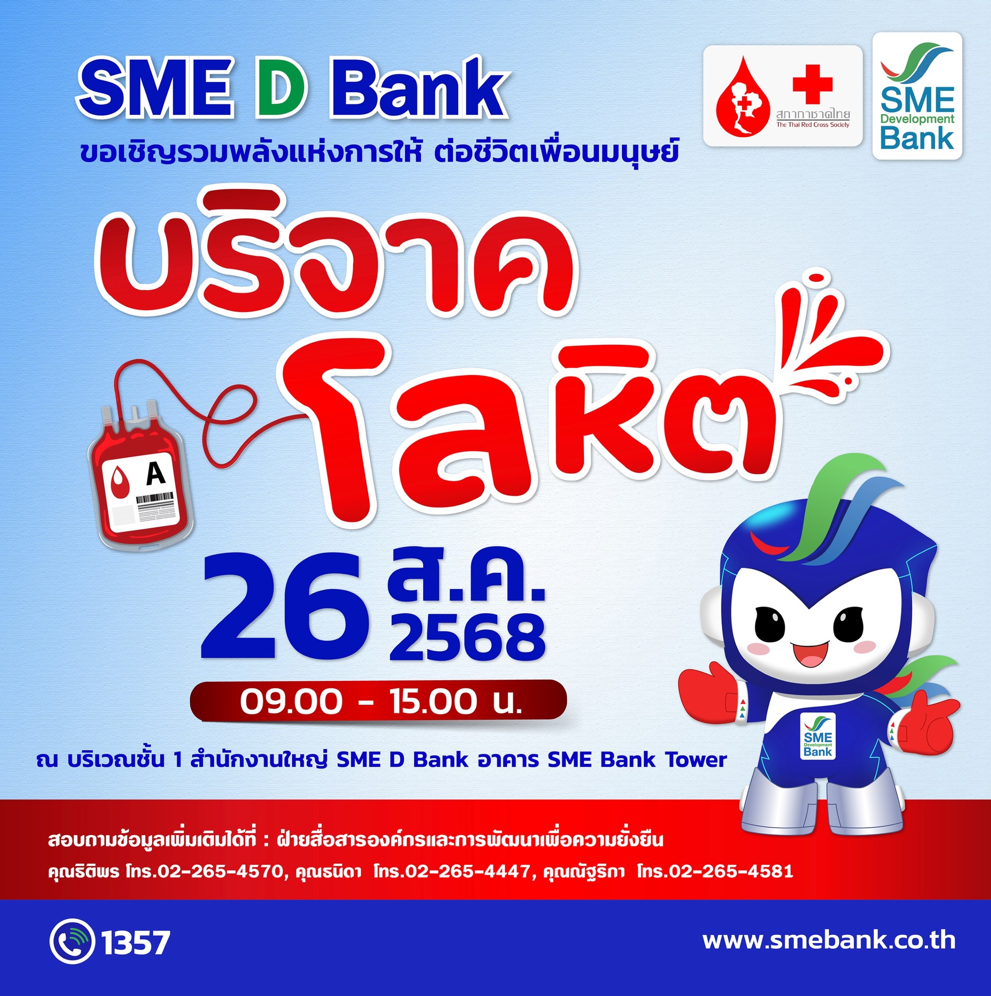 ธนาคารพัฒนาวิสาหกิจขนาดกลางและขนาดย่อมแห่งประเทศไทย (ธพว.) หรือ SME D Bank ร่วมกับ ศูนย์บริการโลหิตแห่งชาติ สภากาชาดไทย เชิญชวนประชาชนผู้มีจิตอาสา ร่วมบริจาคโลหิต ในกิจกรรม “รวมพลังแห่งการให้ ส่งต่อชีวิตเพื่อนมนุษย์” ในวันที่ 26 สิงหาคม 2568 ณ บริเวณชั้น 1 อาคาร SME Bank Tower ตั้งแต่เวลา 09.00 – 15.00 น. เพื่อเติมเต็มปริมาณสำรองโลหิตให้เพียงพอต่อการรักษาพยาบาลผู้ป่วยทั่วประเทศ ทั้งนี้ การจัดกิจกรรมรับบริจาคโลหิตดังกล่าว เพื่อเฉลิมพระเกียรติและถวายเป็นพระราชกุศล