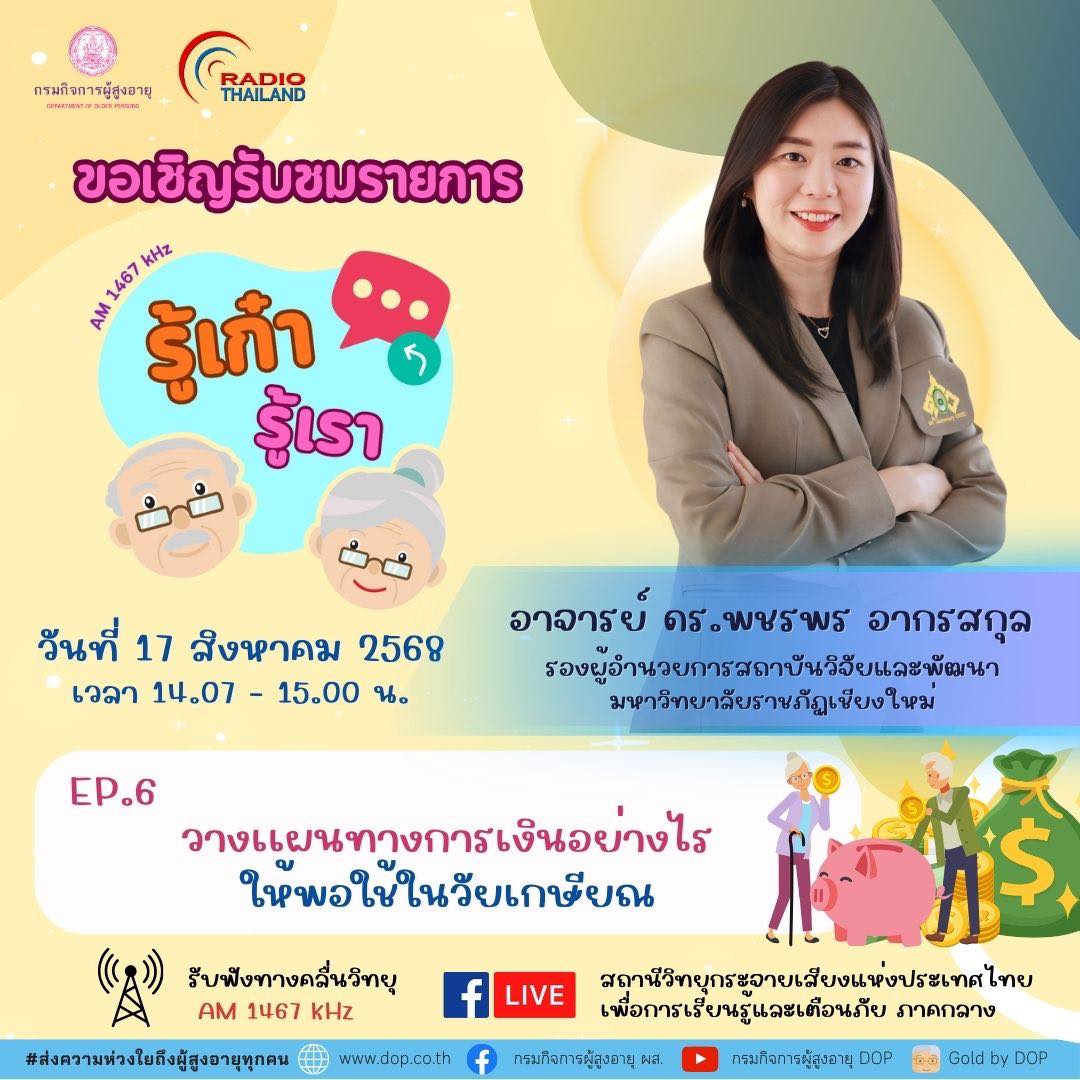 กรมกิจการผู้สูงอายุ ขอเชิญรับชมรายการ รู้เก๋า รู้เรา ประเด็น : วางเเผนทางการเงินอย่างไรให้พอใช้ในวัยเกษียณ วันที่ 17 สิงหาคม 2568 เวลา 14.07 – 15.00 น. ออกอากาศทาง : สถานีวิทยุกระจายเสียงแห่งประเทศไทยเพื่อการเรียนรู้และเตือนภัย ภาคกลาง AM 1467kHz เเละเฟสบุ๊คสถานีวิทยุกระจายเสียงแห่งประเทศไทยเพื่อการเรียนรู้และเตือนภัย ภาคกลาง ให้สัมภาษณ์ โดย อาจารย์ ดร.พชรพร อากรสกุล รองผู้อำนวยการสถาบันวิจัยและพัฒนา มหาวิทยาลัยราชภัฏเชียงใหม่