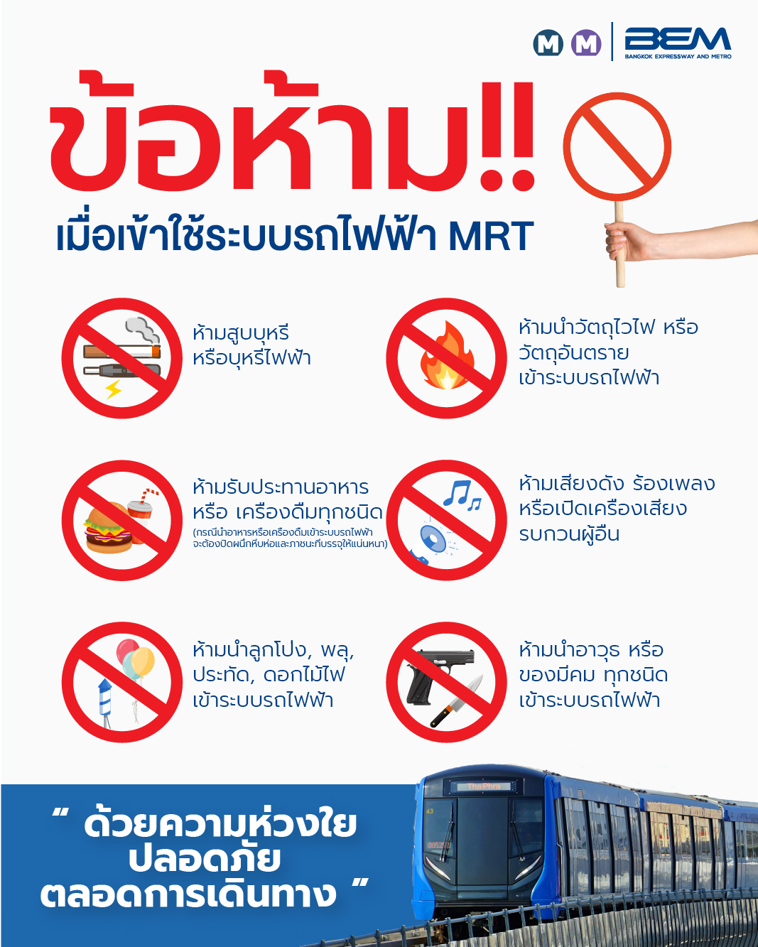 BEM แนะนำข้อปฏิบัติที่ห้ามทำ เมื่อเดินทางด้วยรถไฟฟ้า MRT ข่าวสารกิจกรรม BEM แนะนำข้อปฏิบัติที่ห้ามทำ เมื่อเดินทางด้วยรถไฟฟ้า MRT บริษัท ทางด่วนและรถไฟฟ้ากรุงเทพ จำกัด (มหาชน) แนะนำข้อปฏิบัติที่ห้ามทำ เมื่อเดินทางด้วยรถไฟฟ้า MRT หากพบเห็นบุคคลต้องสงสัยระหว่างเดินทาง สามารถแจ้งเจ้าหน้าที่สถานีได้ตลอด บริษัท ทางด่วนและรถไฟฟ้ากรุงเทพ จำกัด (มหาชน) แนะนำข้อปฏิบัติที่ห้ามทำ เมื่อเดินทางด้วยรถไฟฟ้า MRTห้ามสูบบุหรี่ หรือบุหรี่ไฟฟ้าภายในระบบรถไฟฟ้าห้ามนำวัตถุไวไฟ หรือวัตถุอันตรายเข้าระบบรถไฟฟ้าห้ามรับประทานอาหาร หรือเครื่องดื่มทุกชนิดห้ามเสียงดัง ร้องเพลง หรือเปิดเครื่องเสียงรบกวนผู้อื่นห้ามนำลูกโป่ง พลุ, ประทัด, ดอกไม้ไฟ เข้าระบบรถไฟฟ้าห้ามนำอาวุธ หรือของมีคมทุกชนิด เข้าระบบรถไฟฟ้า หากพบเห็นบุคคลต้องสงสัยระหว่างเดินทาง สามารถแจ้งเจ้าหน้าที่สถานีได้ตลอด ที่มา : Facebook BEM Bangkok Expressway and Metro Post Views: 30 FacebookFacebookXTwitterLINELine