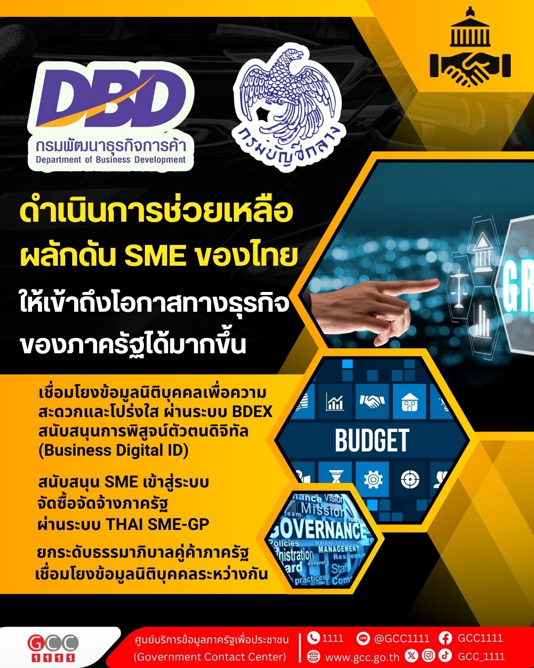 - การเชื่อมโยงข้อมูลนิติบุคคลเพื่อความสะดวกและโปร่งใส โดยช่วงเวลาที่ผ่านมากรมพัฒนาธุรกิจการค้าและกรมบัญชีกลางได้ดำเนินการเชื่อมโยงข้อมูลนิติบุคคลผ่านระบบ BDEX พร้อมสนับสนุนการพิสูจน์ตัวตนดิจิทัล (Business Digital ID) สำเร็จแล้วช่วยให้ SME และภาคธุรกิจสามารถเข้าสู่ระบบจัดซื้อจัดจ้างภาครัฐได้ง่ายและรวดเร็วยิ่งขึ้น ที่สำคัญช่วยลดขั้นตอนการเรียกสำเนาเอกสารนิติบุคคลด้วย