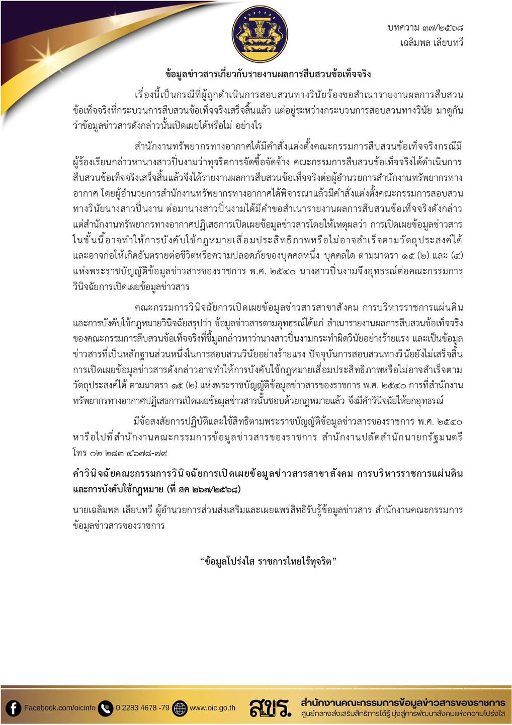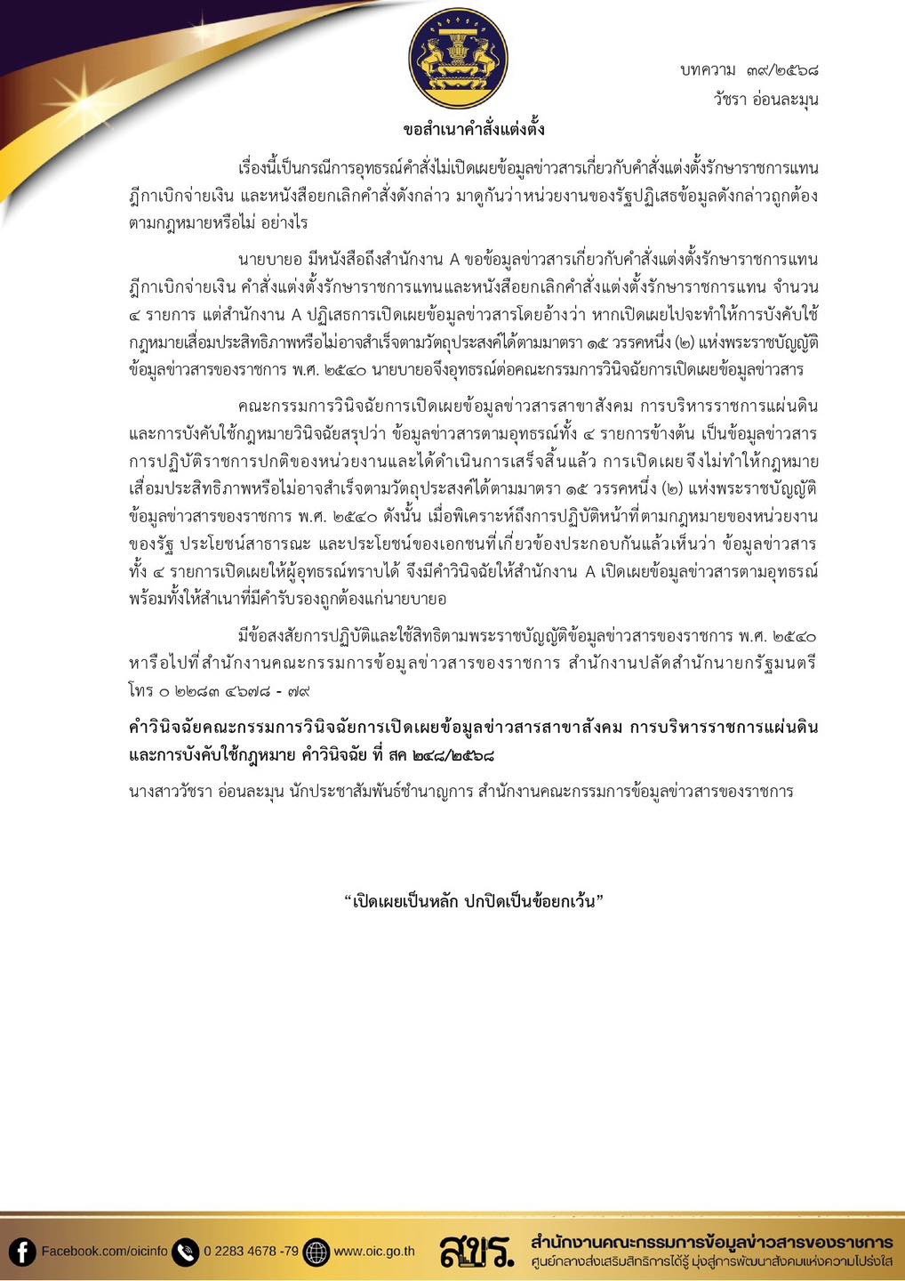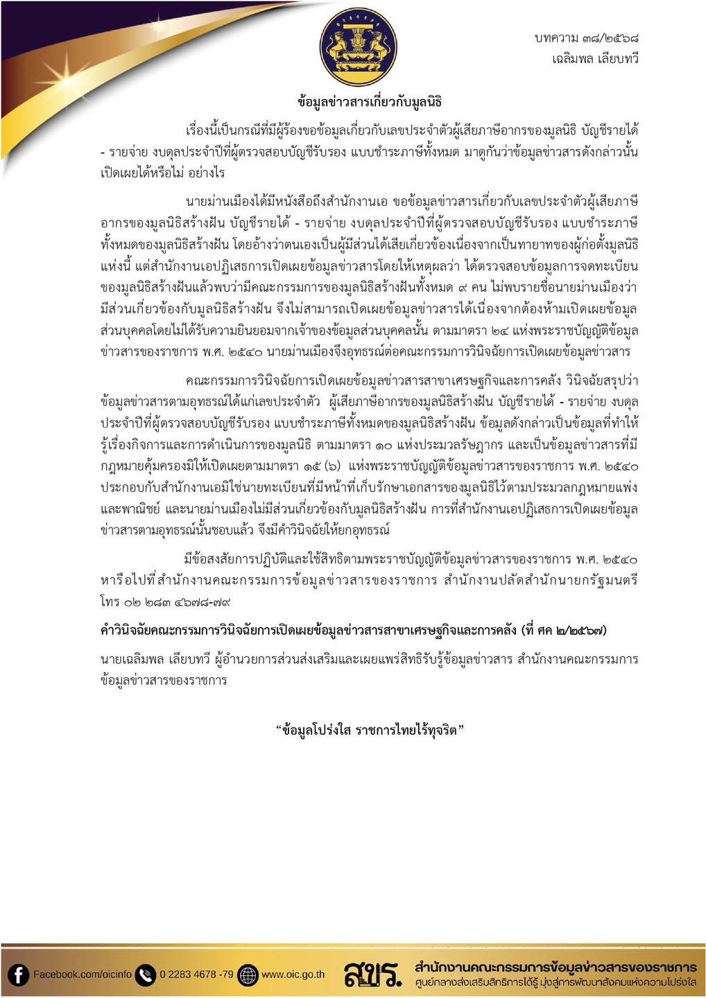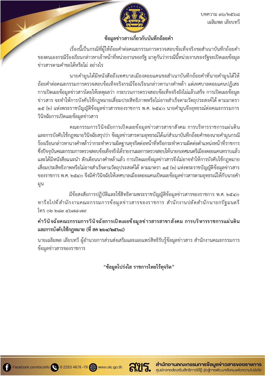 สำนักงานคณะกรรมการคุ้มครองผู้บริโภค แนะนำ บทความการขอข้อมูลข่าวสารของทางราชการ