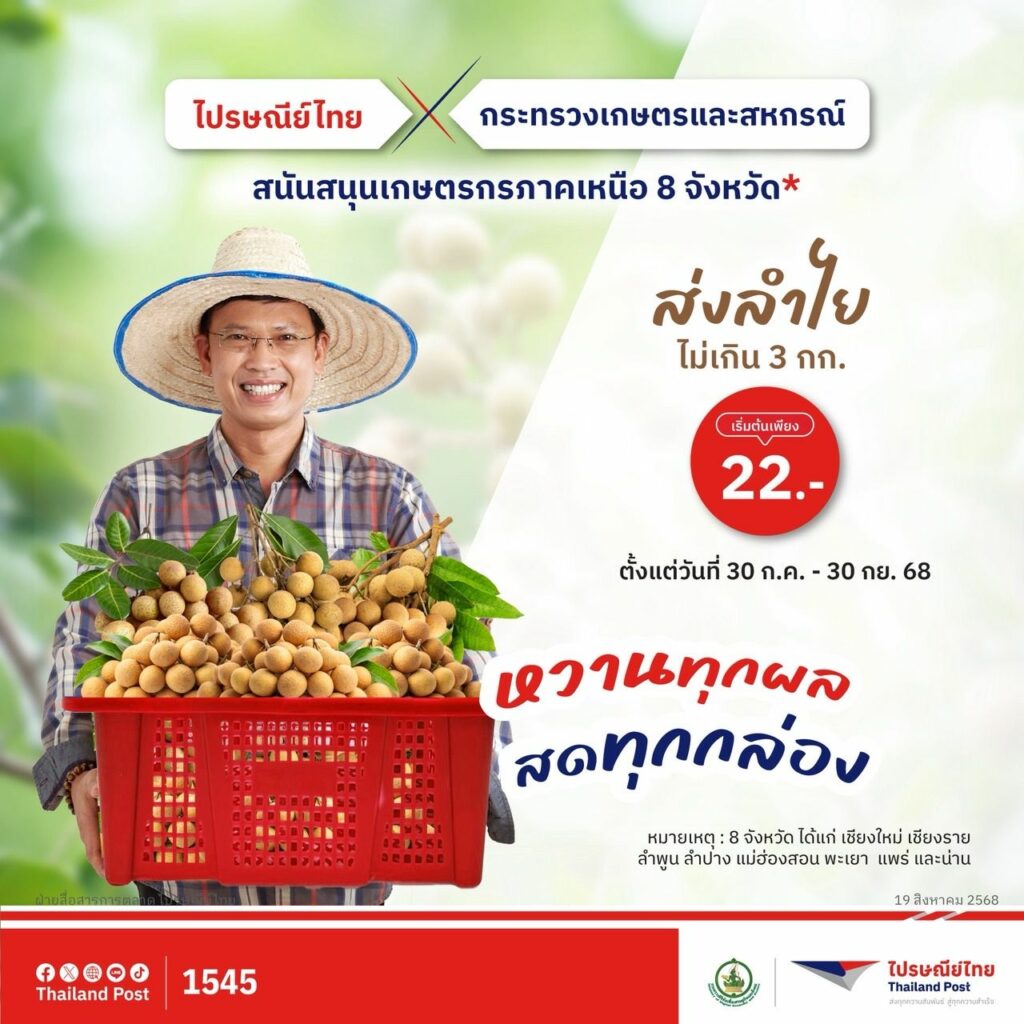 ไปรษณีย์ไทย ร่วมกับ กระทรวงเกษตรและสหกรณ์ หนุนเกษตรกร 8 จังหวัดภาคเหนือ ส่งลำไยทั่วไทย เริ่มต้น 3 กิโลกรัม เพียง 22 บาท ตั้งแต่บัดนี้ – 30 กันยายน 2568