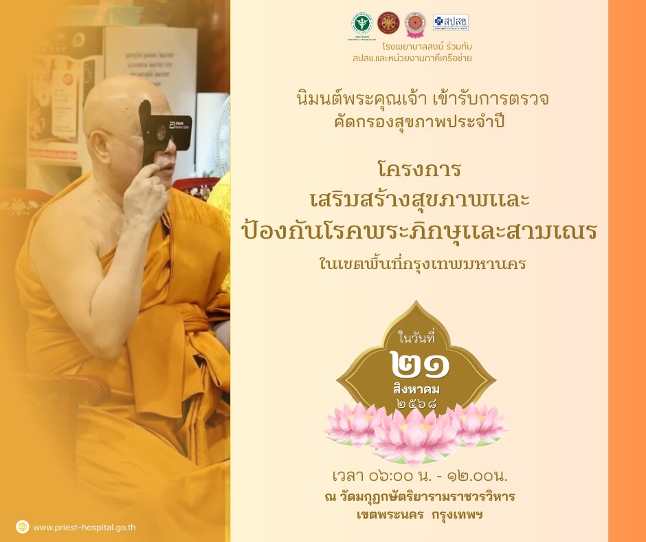 โรงพยาบาลสงฆ์ ร่วมกับหน่วยงานภาคีเครือข่ายจัดโครงการตรวจคัดกรองสุขภาพพระสงฆ์สามเณรในเขตกรุงเทพมหานคร วันพฤหัสบดีที่ 21 สิงหาคม 2568 ตั้งแต่เวลา 06.00 – 12.00 น. ณ วัดมกุฏกษัตริยารามราชวรวิหาร เขตพระนคร กรุงเทพฯ