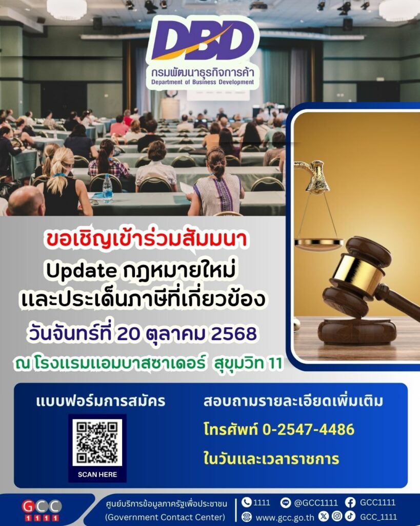กรมพัฒนาธุรกิจการค้า จัดงานสัมมนา Update กฎหมายใหม่และประเด็นภาษีที่เกี่ยวข้อง วันที่ 20 ตุลาคม 2568