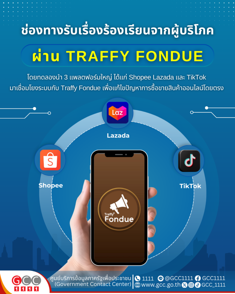 สคบ. ร่วมกับ สวทช. นำระบบ Traffy Fondue มาใช้เป็นช่องทางรับเรื่องร้องเรียนจากผู้บริโภค เพื่อความสะดวก โปร่งใส และติดตามความคืบหน้าได้ พร้อมบูรณาการทำงานกับกว่า 25 หน่วยงานที่เกี่ยวข้อง และเชื่อมโยงแพลตฟอร์มออนไลน์รายใหญ่ ได้แก่ Shopee, Lazada และ TikTok เพื่อแก้ไขปัญหาการซื้อขายสินค้าออนไลน์ เริ่มใช้ตั้งแต่วันที่ 20 สิงหาคม 2568 เป็นต้นไป โดย สคบ. จะประเมินผลเพื่อพัฒนาการคุ้มครองผู้บริโภคต่อไป