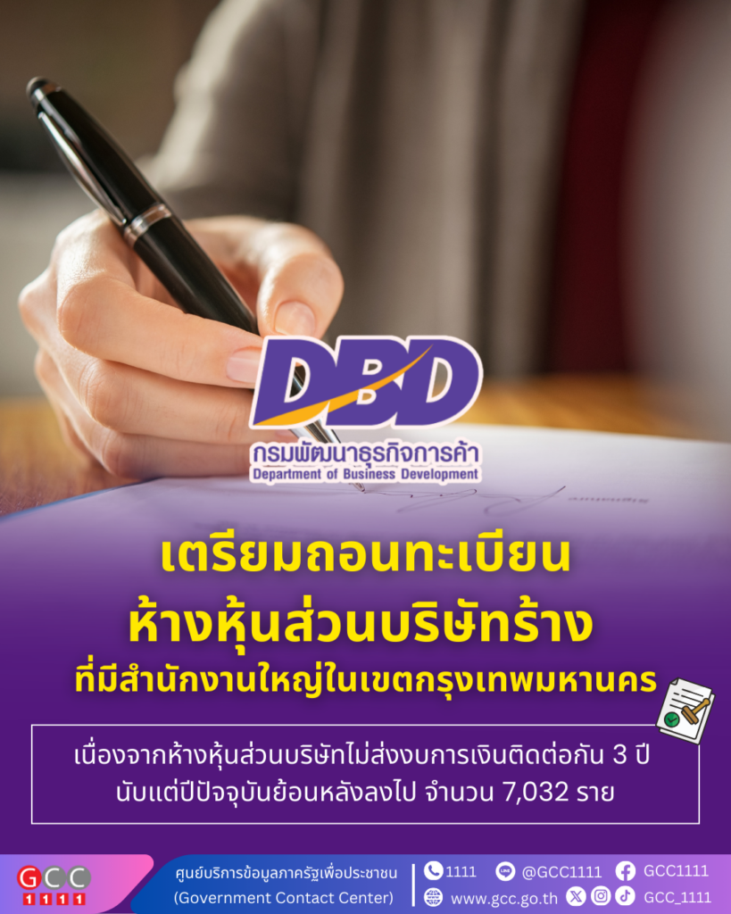 กรมพัฒนาธุรกิจการค้า จะทำการถอนทะเบียนห้างหุ้นส่วนบริษัทร้างที่มีสำนักงานใหญ่ในเขตกรุงเทพมหานครออกจากทะเบียน กรณีห้างหุ้นส่วนบริษัทไม่ส่งงบการเงินติดต่อกัน 3 ปี นับแต่ปีปัจจุบันย้อนหลังลงไป จำนวน 7,032 ราย