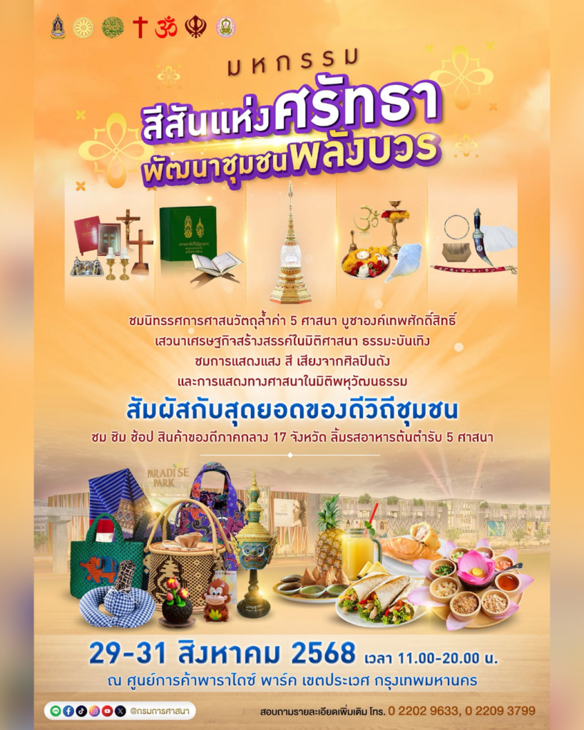 กรมการศาสนา ขอเชิญร่วมงานมหกรรมสุดยิ่งใหญ่แห่งปี “สีสันแห่งศรัทธา พัฒนาชุมชนพลังบวร ระหว่างวันที่ 29 – 31 สิงหาคม 2568 เวลา 11.00 – 20.00 น. ณ ศูนย์การค้าพาราไดซ์ พาร์ค เขตประเวศ กรุงเทพมหานคร