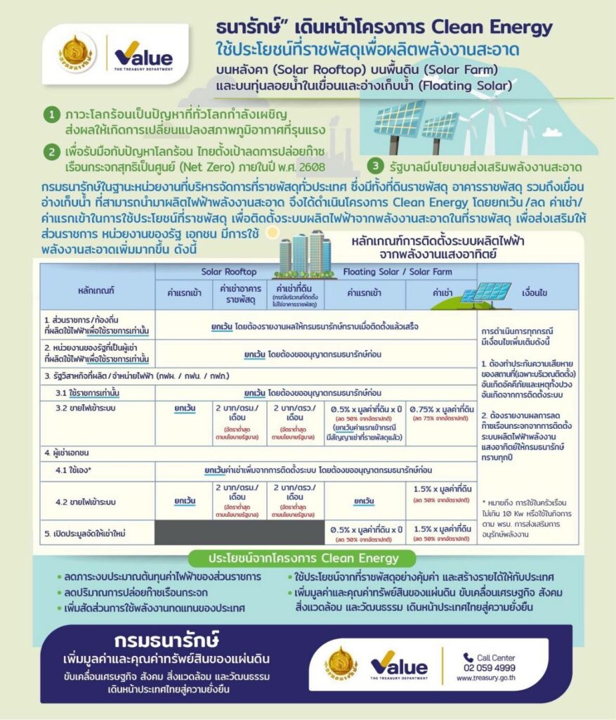 กรมธนารักษ์ได้กำหนด “หลักเกณฑ์กลางการใช้ประโยชน์ที่ราชพัสดุเพื่อติดตั้งระบบผลิตไฟฟ้าจากพลังงานแสงอาทิตย์” สำหรับหน่วยงานที่ประสงค์เข้าร่วมโครงการ Clean Energy โดยเปิดโอกาสให้นำที่ราชพัสดุมาพัฒนาเป็นแหล่งผลิตไฟฟ้าพลังงานสะอาด ภายใต้เงื่อนไขดังต่อไปนี้