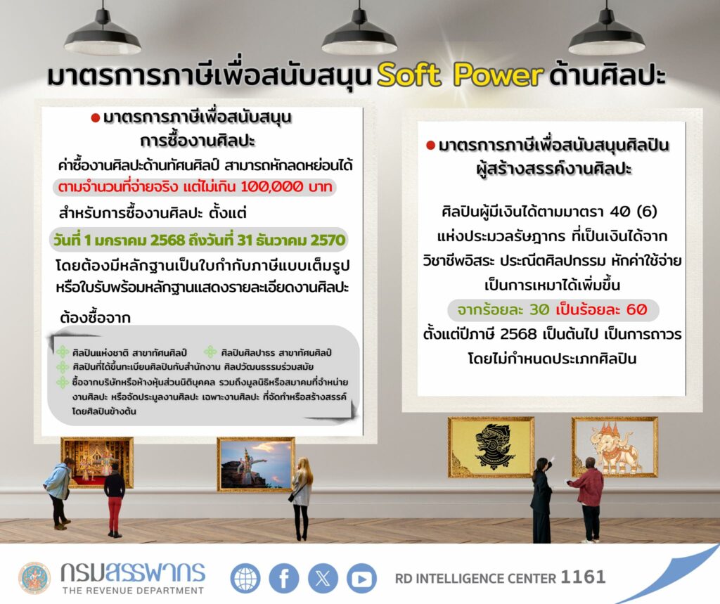 กรมสรรพากร ประชาสัมพันธ์ มาตรการภาษีเพื่อสนับสนุน Soft Power ด้านศิลปะ ดังนี้ มาตรการภาษีเพื่อสนับสนุนการซื้อผลงานศิลปะ และมาตรการภาษีเพื่อสนับสนุนศิลปินผู้สร้างสรรค์งานศิลปะ เพื่อร่วมกันสนับสนุนศิลปะไทยและเสริมสร้าง Soft Power ของประเทศ