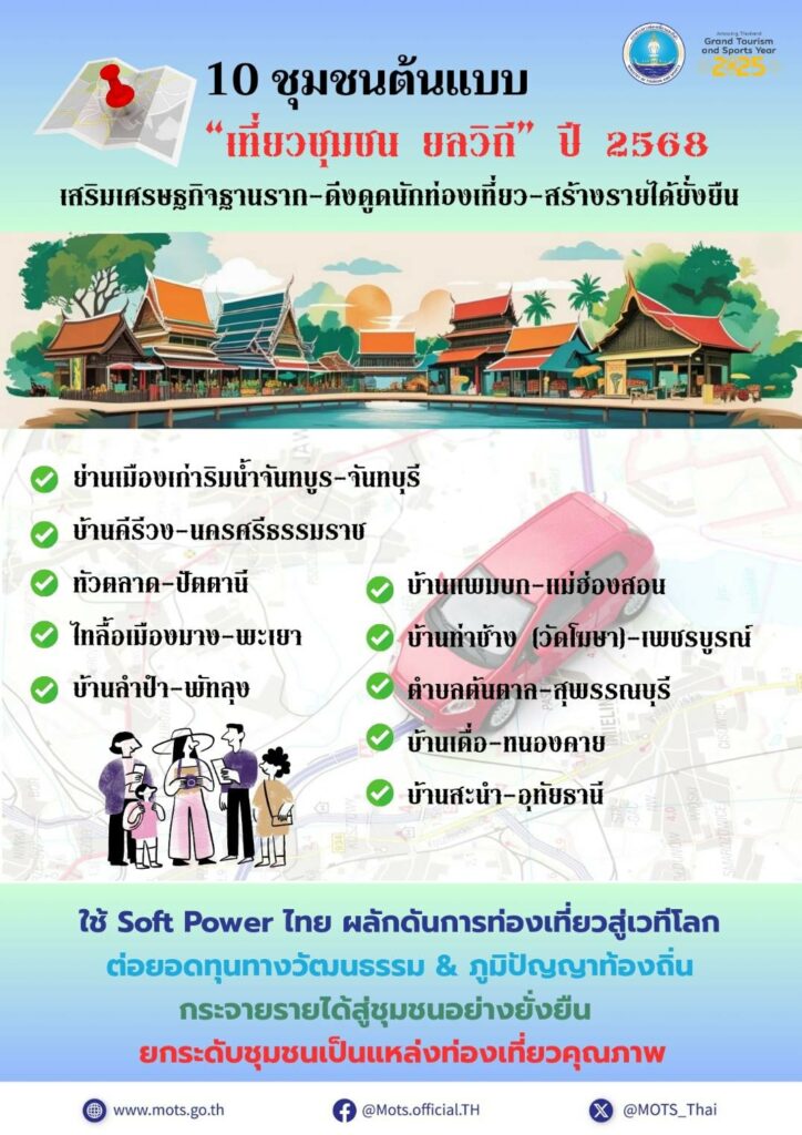 กระทรวงการท่องเที่ยวและกีฬา ขอร่วมแสดงความยินดีกับ 10 ชุมชนต้นแบบ “เที่ยวชุมชน ยลวิถี” ประจำปี 2568 ที่ได้รับการคัดเลือกจากกระทรวงวัฒนธรรม ภายใต้นโยบายรัฐบาลในการผลักดัน Soft Power ไทย โดยมีเป้าหมายเพื่อส่งเสริมเศรษฐกิจฐานราก กระตุ้นการเดินทางท่องเที่ยว และสร้างรายได้อย่างยั่งยืนให้แก่ท้องถิ่น