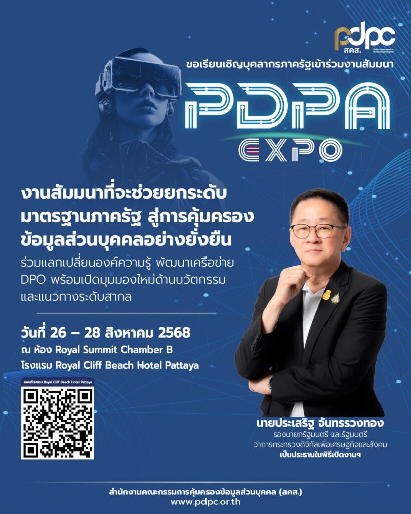 สำนักงานคณะกรรมการคุ้มครองข้อมูลส่วนบุคคล จัดงาน PDPA EXPO งานสัมมนาที่จะยกระดับการคุ้มครองข้อมูลส่วนบุคคลภาครัฐสู่มาตรฐานระดับสากล วันที่ 26 – 28 สิงหาคม 2568 ณ Royal Summit Chamber B, Isousu Royal Cliff Beach Hotel Pattaya