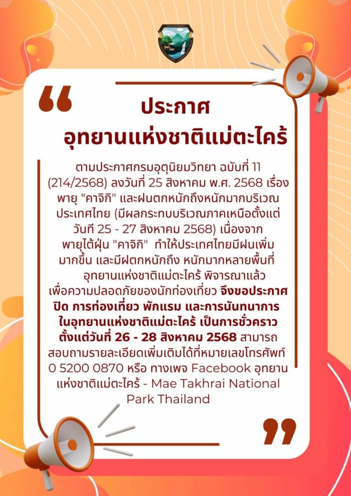 อุทยานแห่งชาติแม่ตะไคร้ ประกาศปิดการท่องเที่ยว พักแรม และกิจกรรมนันทนาการชั่วคราว ตั้งแต่วันที่ 26 – 28 สิงหาคม 2568 เพื่อความปลอดภัยของนักท่องเที่ยว