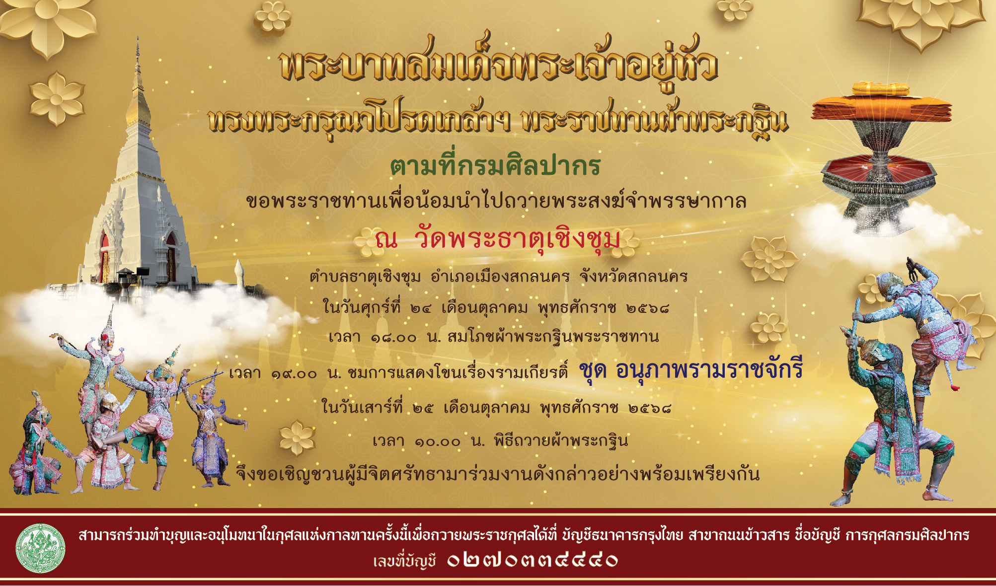 กรมศิลปากร กำหนดถวายผ้าพระกฐินพระราชทาน ประจำปี 2568 ณ วัดพระธาตุเชิงชุมวรวิหาร ตำบลธาตุเชิงชุม อำเภอเมืองสกลนคร จังหวัดสกลนคร ในวันเสาร์ที่ 25 ตุลาคม 2568 เวลา 10.00 น.