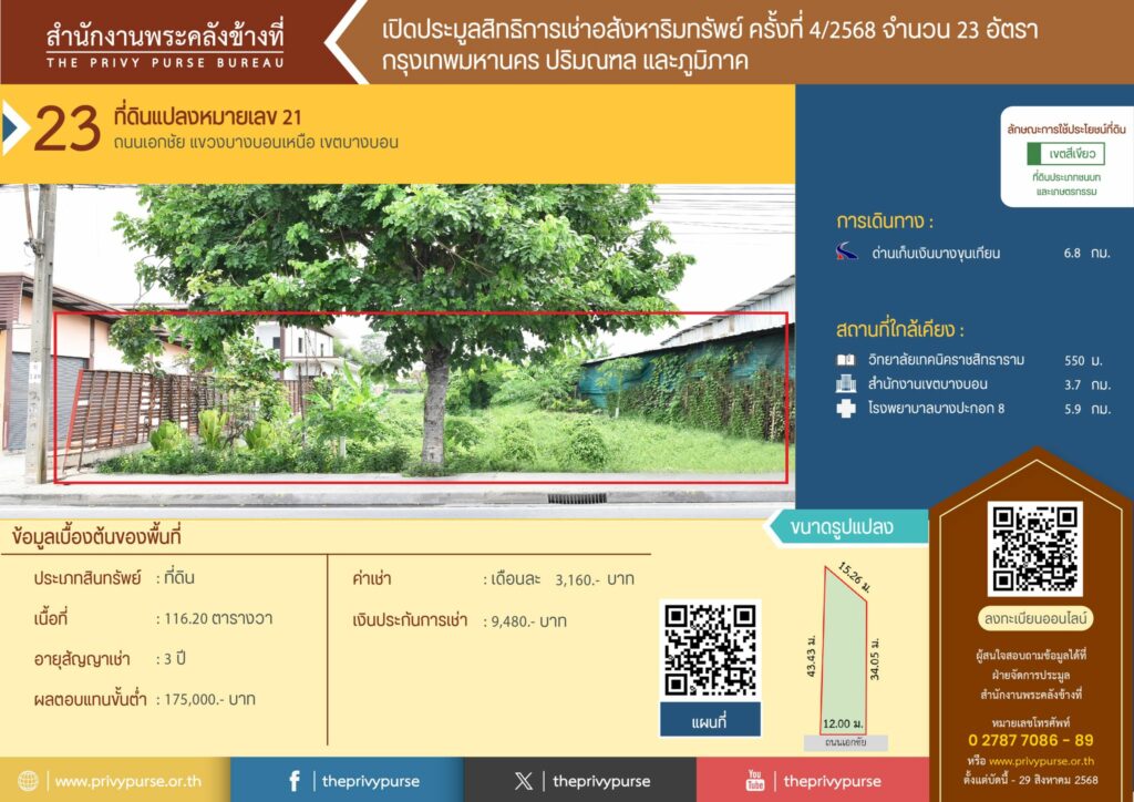 สำนักงานพระคลังข้างที่ เปิดประมูลสิทธิการเช่า 3 ปี ที่ดินแปลงหมายเลข 21 ค่าเช่าเริ่มต้นที่ 3,160.- บาท/เดือน ที่ดินย่านบางบอน ติดถนนเอกชัย การคมนาคมสะดวก ตั้งอยู่ในแหล่งชุมชน เหมาะสำหรับพาณิชยกรรม และอยู่อาศัย