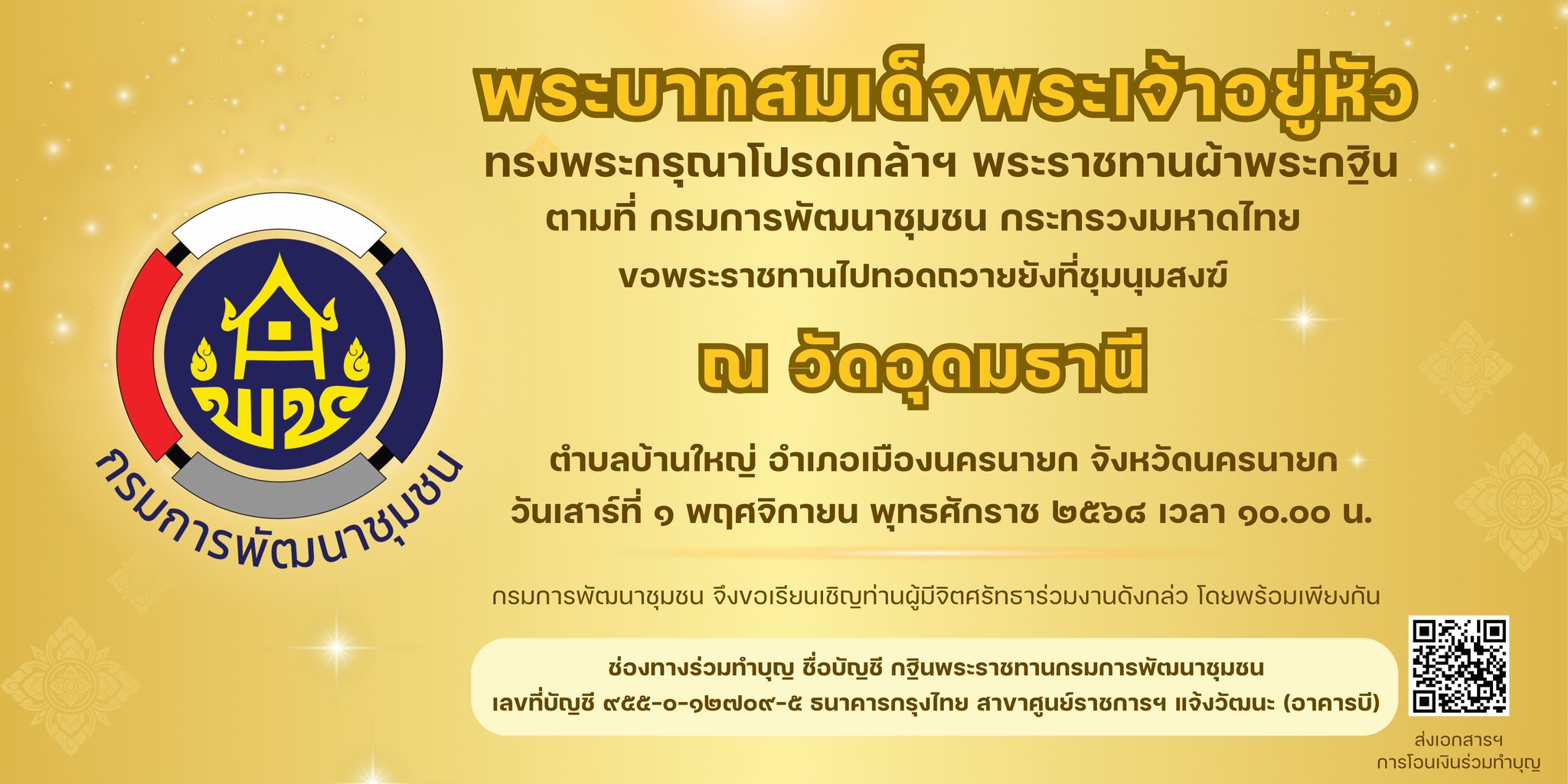 กรมการพัฒนาชุมชน ขอเชิญร่วมทำบุญถวายผ้าพระกฐินพระราชทาน ในวันเสาร์ที่ 1 พฤศจิกายน 2568