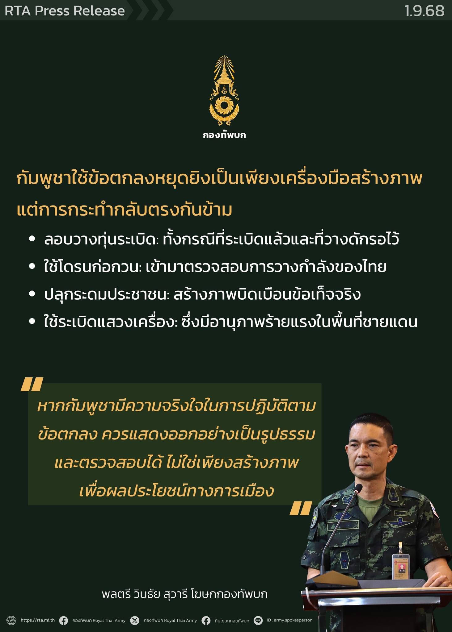 กองทัพบก ชี้คำกล่าวอ้างกัมพูชา พบพฤติกรรมขัดแย้งกับภาพลักษณ์ “ประเทศรักสันติภาพ” หากกัมพูชามีความจริงใจในการปฏิบัติตามข้อตกลง ควรแสดงออกอย่างเป็นรูปธรรมและตรวจสอบได้ ไม่ใช่เพียงสร้างภาพเพื่อผลประโยชน์ทางการเมือง