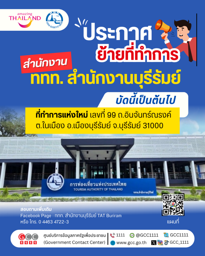 ททท. สำนักงานบุรีรัมย์ ประกาศย้ายที่ทำการสำนักงานตั้งแต่วันที่ 1 กันยายน 2568 เป็นต้นไป ข่าวสารกิจกรรม ททท. สำนักงานบุรีรัมย์ ประกาศย้ายที่ทำการสำนักงานตั้งแต่วันที่ 1 กันยายน 2568 เป็นต้นไป การท่องเที่ยวแห่งประเทศไทย สำนักงานบุรีรัมย์ ประกาศย้ายที่ทำการสำนักงาน ตั้งแต่วันที่ 1 กันยายน 2568 เป็นต้นไป ที่ทำการแห่งใหม่ เลขที่ 99 ถนนอินจันทร์ณรงค์ ตำบลในเมือง อำเภอเมืองบุรีรัมย์ จังหวัดบุรีรัมย์ 31000 พิกัด : https://maps.app.goo.gl/ikS7dNbJGvzmFjtu8 สอบถามเพิ่มเติม Facebook Page : ททท. สำนักงานบุรีรัมย์ TAT Buriram หรือ โทร. 0 4463 4722-3 ที่มา : Facebook ททท. สำนักงานบุรีรัมย์ TAT Buriram Post Views: 22 FacebookFacebookXTwitterLINELine