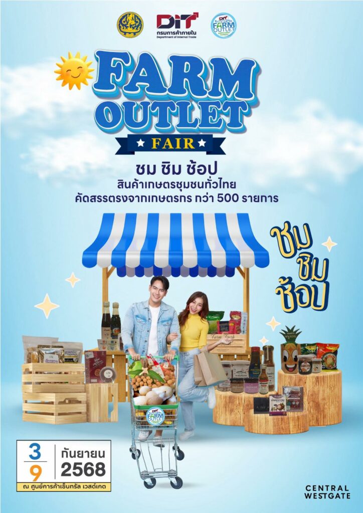 กรมการค้าภายใน ชวน ชม ช้อป สินค้าเกษตรคุณภาพ ในงาน “Farm Outlet Fair” ระหว่างวันที่ 3 – 9 กันยายน 2568 ณ ลานโปรโมชั่น ชั้น 1 ศูนย์การค้า เซ็นทรัล เวสต์เกต ภายในงาน ชม ชิม ช้อป สินค้าเกษตรชุมชนทั่วไป คัดสรรตรงจากเกษตรกร กว่า 500 ราย