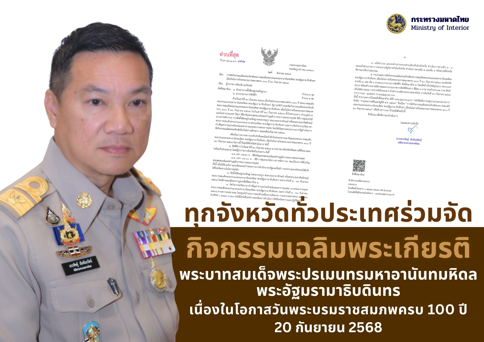 กระทรวงมหาดไทย เชิญชวนร่วมเฉลิมพระเกียรติในโอกาส วันพระบรมราชสมภพครบ 100 ปี ของ พระบาทสมเด็จพระปรเมนทรมหาอานันทมหิดล (พระอัฐมรามาธิบดินทร) ในวันที่ 20 กันยายน 2568