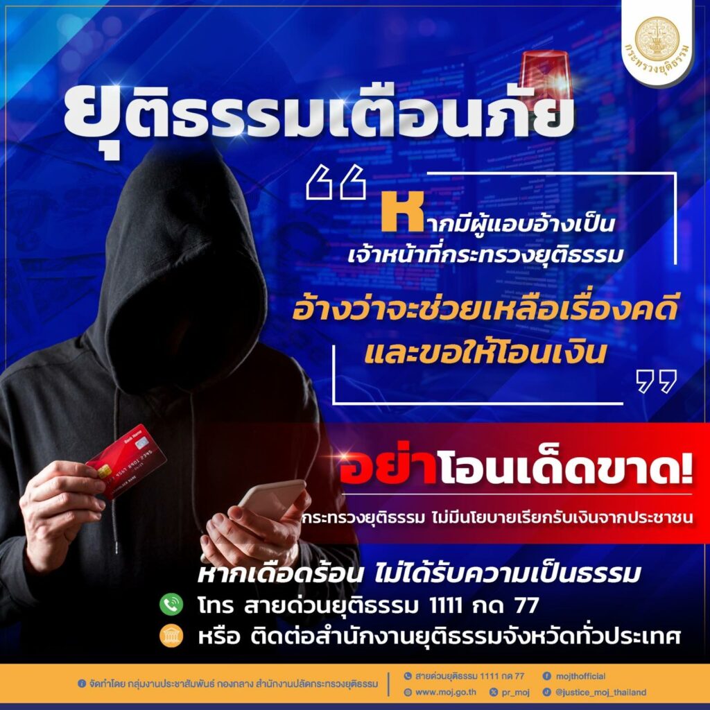 กระทรวงยุติธรรม แจ้งเตือนภัย หากมีผู้แอบอ้างเป็นเจ้าหน้าที่กระทรวงยุติธรรม โดยอ้างว่าจะช่วยเหลือเรื่องคดี และขอให้โอนเงิน อย่าโอนเงินเด็ดขาด ทั้งนี้ กระทรวงยุติธรรม ไม่มีนโยบายเรียกรับเงินจากประชาชน หากเดือดร้อน ไม่ได้รับความเป็นธรรม โทร สายด่วนยุติธรรม 1111 กด 77 หรือ ติดต่อสำนักงานยุติธรรมจังหวัดทั่วประเทศ
