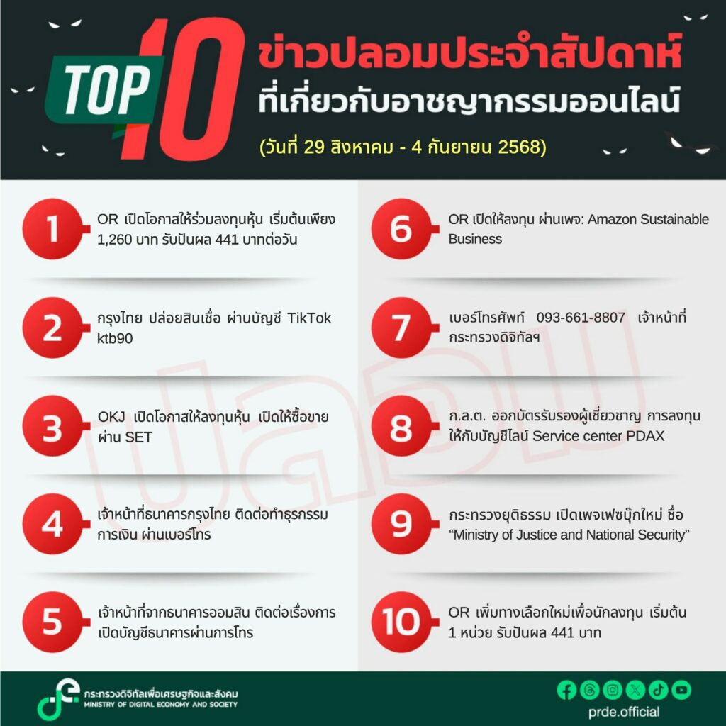 กระทรวงดิจิทัลเพื่อเศรษฐกิจและสังคม (ดีอี) ตรวจพบข่าวปลอมรายสัปดาห์ที่เกี่ยวข้องกับอาชญากรรมออนไลน์ ซึ่งประชาชนให้ความสนใจสูงสุดอันดับที่ 1 เรื่อง “OR เปิดโอกาสให้ร่วมลงทุนหุ้น เริ่มต้น 1,260 บาท รับปันผล 441 บาทต่อวัน” รองลงมาคือเรื่อง “กรุงไทย ปล่อยสินเชื่อ ผ่านบัญชี TikTok ktb90” โดยขอให้ประชาชน อย่าหลงเชื่อข่าวปลอม หวั่นสร้างความเสียหายทั้งข้อมูลส่วนบุคคล ทรัพย์สิน และอาจส่งผลกระทบต่อประชาชนในสังคมเป็นวงกว้าง ขอให้เลือกเชื่อ – แชร์ ข้อมูลที่เป็นประโยชน์