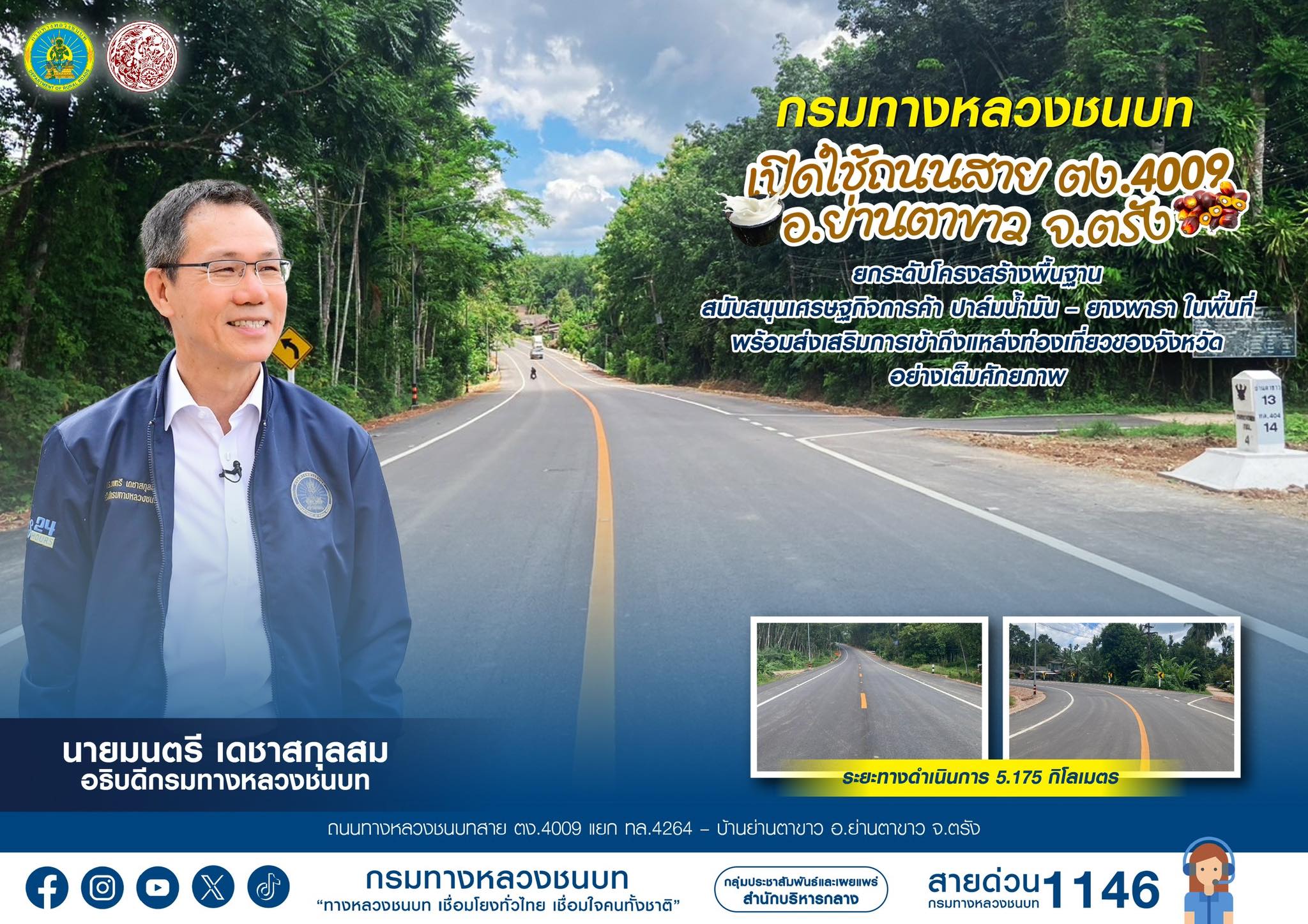 กรมทางหลวงชนบท เปิดใช้ถนนสาย ตง.4009 อ.ย่านตาขาว จ.ตรัง ยกระดับโครงสร้างพื้นฐาน สนับสนุนเศรษฐกิจการค้า ปาล์มน้ำมัน – ยางพาราในพื้นที่ พร้อมส่งเสริมการเข้าถึงแหล่งท่องเที่ยวของจังหวัดอย่างเต็มศักยภาพ