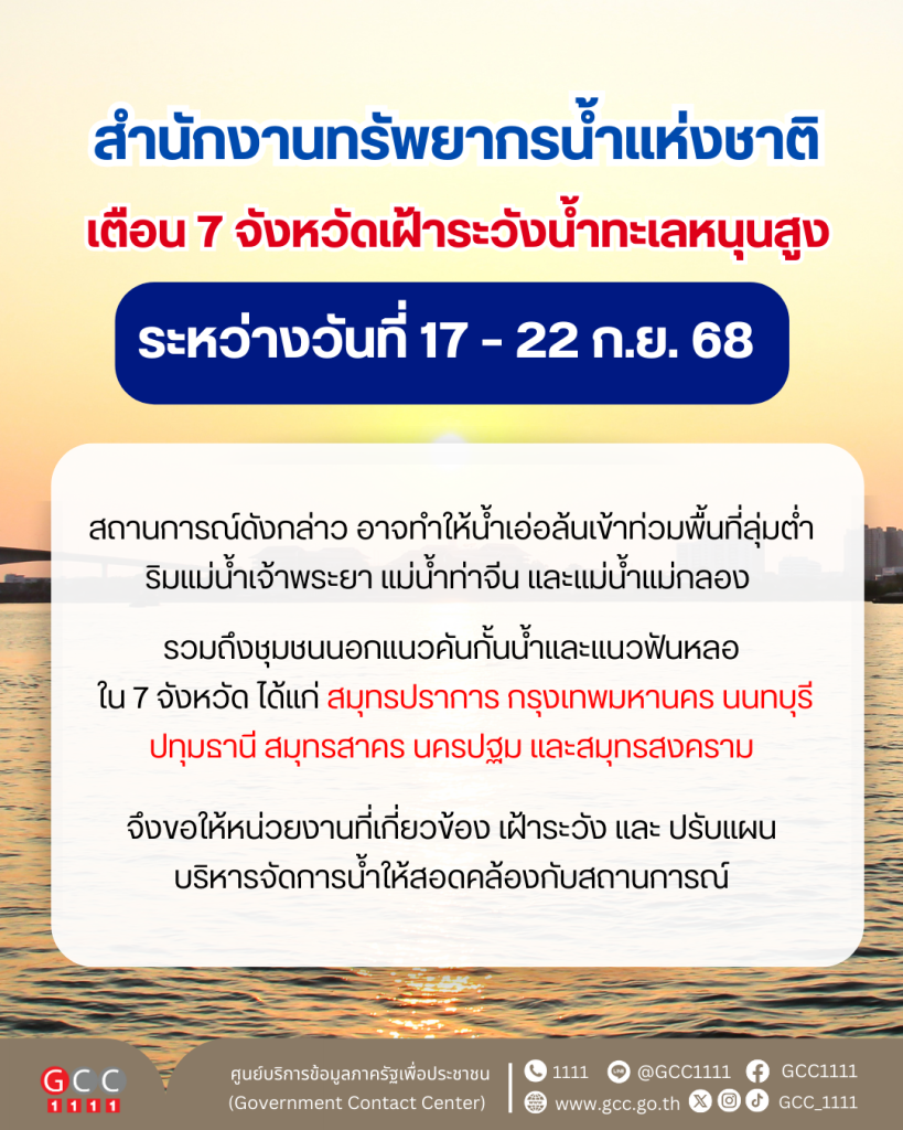 ด้วยสำนักงานทรัพยากรน้ำแห่งชาติ (สทนช.) ได้ติดตามสถานการณ์น้ำทะเลหนุนสูงบริเวณแม่น้ำเจ้าพระยาจากกรมอุทกศาสตร์ โดยคาดหมายระดับน้ำบริเวณป้อมพระจุลจอมเกล้า และพื้นที่ใกล้เคียง ในระหว่างวันที่ 17 – 22 กันยายน 2568 เวลาประมาณ 16.00 – 19.00 น. เป็นช่วงที่ระดับน้ำทะเลหนุนสูง โดยคาดหมายระดับน้ำบริเวณป้อมพระจุลจอมเกล้าและพื้นที่ใกล้เคียงอาจมีความสูงประมาณ 1.70 – 1.90 เมตร จากระดับทะเลปานกลาง ซึ่งสูงกว่าระดับน้ำวิกฤติประมาณ 0.20 เมตร เนื่องจากร่องมรสุมพาดผ่าน ประกอบกับลมตะวันออกเฉียงใต้และมรสุมตะวันตกเฉียงใต้กำลังปานกลางพัดปกคลุม ทำให้มีฝนตกในบางพื้นที่ ส่งผลให้ระดับน้ำในแม่น้ำจะเพิ่มสูงขึ้น เกิดน้ำเอ่อล้นเข้าท่วม เนื่องจากน้ำทะเลหนุนบริเวณพื้นที่ลุ่มต่ำริมแม่น้ำเจ้าพระยา แม่น้ำท่าจีน และแม่น้ำแม่กลอง รวมถึงชุมชนนอกแนวคันกั้นน้ำและแนวเขื่อนชั่วคราวบริเวณที่ไม่มีแนวป้องกันน้ำถาวร (แนวฟันหลอ) บริเวณจังหวัดสมุทรปราการ กรุงเทพมหานคร นนทบุรี ปทุมธานี สมุทรสาคร นครปฐม และสมุทรสงคราม นั้น