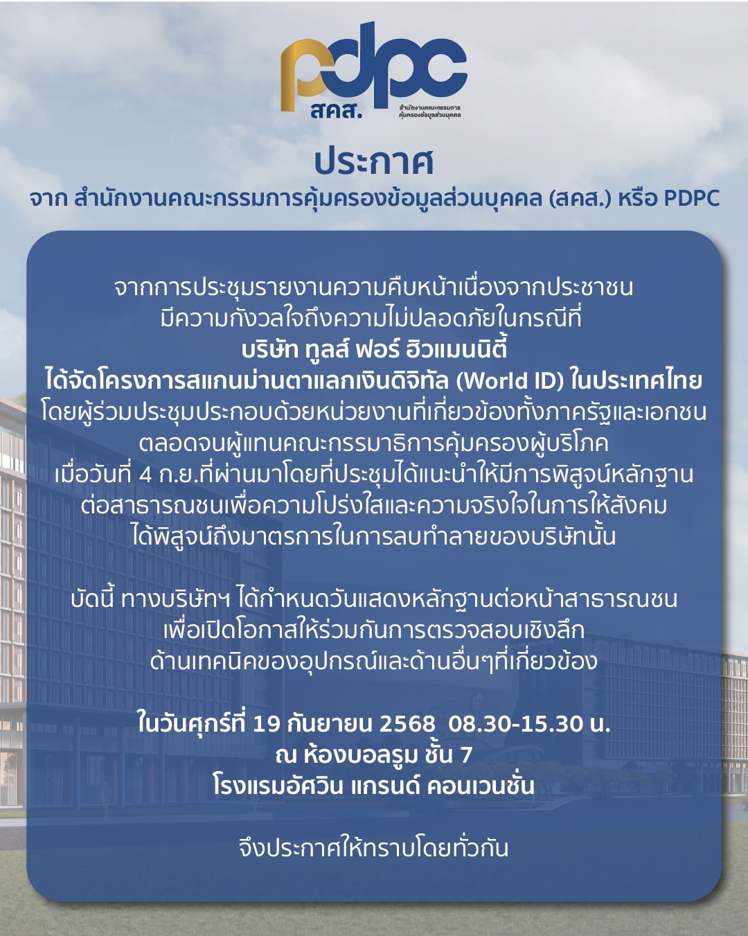 สำนักงานคณะกรรมการคุ้มครองข้อมูลส่วนบุคคล ชี้แจงกรณีที่ บริษัท ทูลส์ ฟอร์ ฮิวแมนนิตี้ จากการประชุมรายงานความคืบหน้าเนื่องจากประชาชน มีความกังวลใจถึงความไม่ปลอดภัยในกรณีที่ บริษัท ทูลส์ ฟอร์ ฮิวแมนนิตี้ ได้จัดโครงการสแกนม่านตาแลกเงินดิจิทัล (World ID) ในประเทศไทย บัดนี้ ทางบริษัทฯ ได้กำหนดวันแสดงหลักฐานต่อหน้าสาธารณชน ในวันศุกร์ที่ 19 กันยายน 2568 เวลา 08.30 – 15.30 น. ณ ห้องบอลรูม ชั้น 7 โรงแรมอัศวิน แกรนด์ คอนเวนชั่น