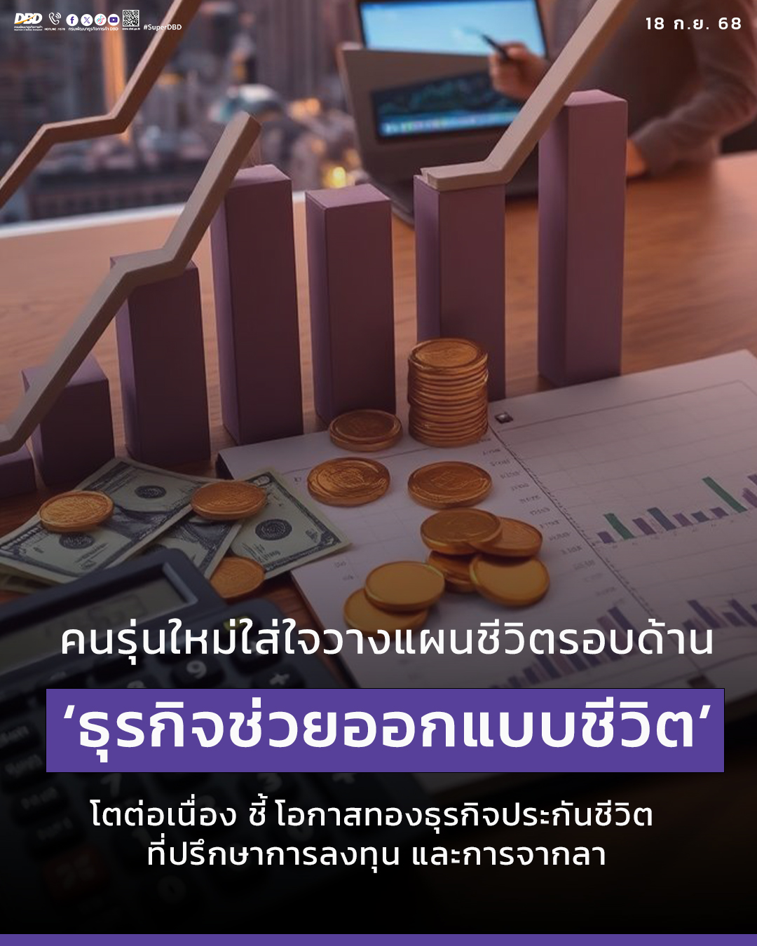 การเปลี่ยนแปลงของโครงสร้างสังคมและพฤติกรรมผู้บริโภค โดยเฉพาะสังคมผู้สูงอายุและครอบครัวขนาดเล็ก ได้ผลักดันให้การวางแผนชีวิตกลายเป็นเรื่องสำคัญ และสร้างโอกาสให้ธุรกิจที่เกี่ยวข้องเติบโต ไม่เพียงแต่ธุรกิจในข้างต้นจะมีมูลค่าทางเศรษฐกิจสูงแต่ยังมีบทบาทโดยตรงต่อคุณภาพชีวิตของประชาชนในทุกช่วงวัย ตั้งแต่การสร้างหลักประกัน ความมั่นคงทางการเงิน ไปจนถึงการจัดการวาระสุดท้ายอย่างมีคุณค่า ซึ่งกรมฯ จะเดินหน้าสนับสนุนผู้ประกอบการ เพื่อให้สามารถปรับตัว สร้างนวัตกรรม และตอบสนองต่อความต้องการของผู้บริโภคยุคใหม่ได้อย่างยั่งยืน” อธิบดี กล่าวทิ้งท้าย