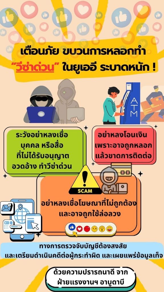 ด้วยกรมการจัดหางานได้รับแจ้งจากสำนักงานปลัดกระทรวงแรงงาน โดยฝ่ายแรงงานประจำสถานเอกอัครราชทูต ณ กรุงอาบูดาบี สหรัฐอาหรับเอมิเรตส์ แจ้งว่า สำนักงานดูแลการเข้าเมืองและเอกสาร (Federal Authority for identity, Nationalty, Custorns and Ports Security: ICP) แจ้งเตือนว่า อย่าหลงเชื่อบริษัทหรือบัญชีทางโชเชียลมีเดียที่ไม่มีใบอนุญาต และอ้างว่าจะดำเนินการ เรื่องทำวีซ่าด่วนได้อย่างรวดเร็ว หรือรับประกันการได้วีซ่าแน่นอน โดยไม่มีเอกสารรับรองจากหน่วยงานที่เกี่ยวข้อง