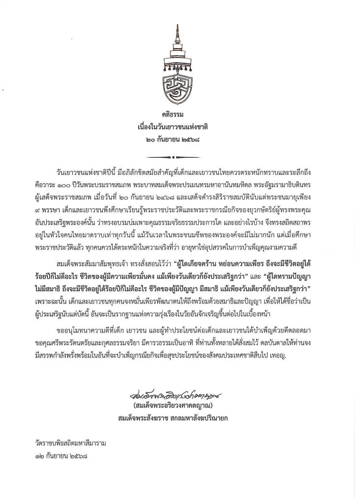 สมเด็จพระสังฆราช ประทานพระคติธรรม เนื่องในวันเยาวชนแห่งชาติ 20 กันยายน 2568