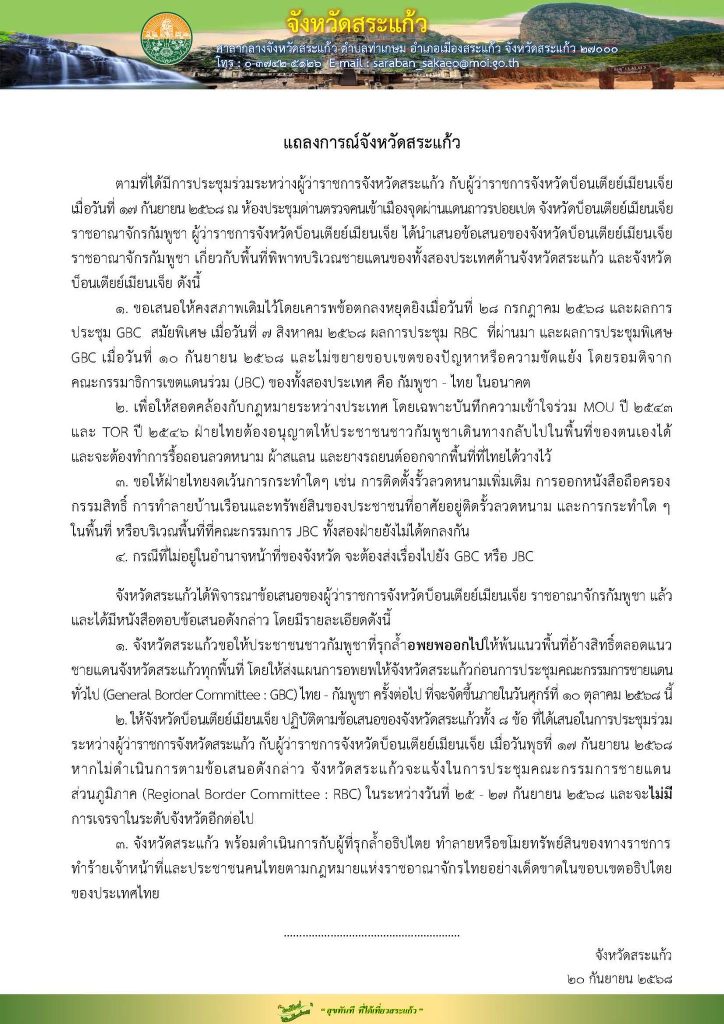 วันนี้ (20 กันยายน) จังหวัดสระแก้ว ออกแถลงการณ์ตามที่ได้มีการประชุมร่วมระหว่างผู้ว่าราชการจังหวัดสระแก้ว กับผู้ว่าราชการจังหวัดบ็อนเตียย์เมียนเจ็ย เมื่อวันที่ 17 กันยายน 2568 ที่ ห้องประชุมถวายความปลอดภัยของจุดผ่านแดนถาวรปอยเปต จังหวัดบ็อนเตียย์เมียนเจ็ย ราชอาณาจักรกัมพูชา ผู้ว่าราชการจังหวัดบ็อนเตียย์เมียนเจ็ย ได้นำเสนอข้อเสนอของจังหวัดบ็อนเตียย์เมียนเจ็ย ราชอาณาจักรกัมพูชา เกี่ยวกับพื้นที่พิพาทบริเวณชายแดนของทั้งสองประเทศด้านจังหวัดสระแก้ว และจังหวัดบ็อนเตียย์เมียนเจ็ย ดังนี้