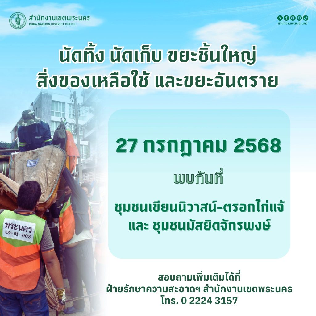 สำนักงานเขตพระนคร นัดทิ้ง นัดเก็บขยะชิ้นใหญ่ สิ่งของเหลือใช้และขยะอันตราย บริการฟรี ไม่มีค่าใช้จ่าย
