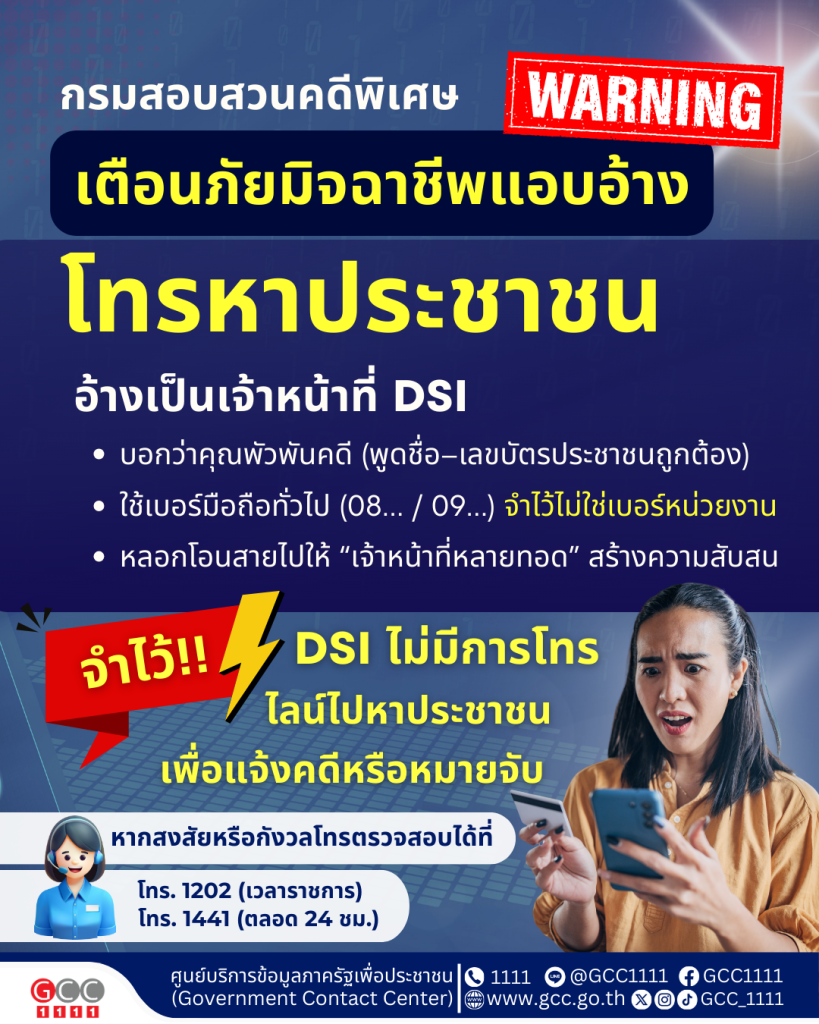 กรมสอบสวนคดีพิเศษ เตือนภัยมิจฉาชีพแอบอ้างโทรหาประชาชน จำไว้! DSI ยืนยันว่า ไม่มีการโทร/ไลน์ไปหาประชาชนเพื่อแจ้งคดีหรือหมายจับ