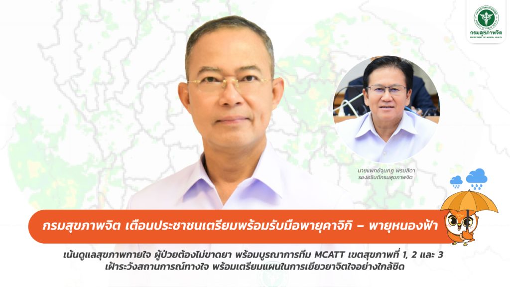 กรมสุขภาพจิต เตือนประชาชนเตรียมพร้อมรับมือพายุคาจิกิ – พายุหนองฟ้า เน้นดูแลสุขภาพกายใจ ผู้ป่วยต้องไม่ขาดยา พร้อมบูรณาการทีม MCATT เขตสุขภาพที่ 1, 2 และ 3 เฝ้าระวังสถานการณ์ทางใจ พร้อมเตรียมแผนในการเยียวยาจิตใจอย่างใกล้ชิด