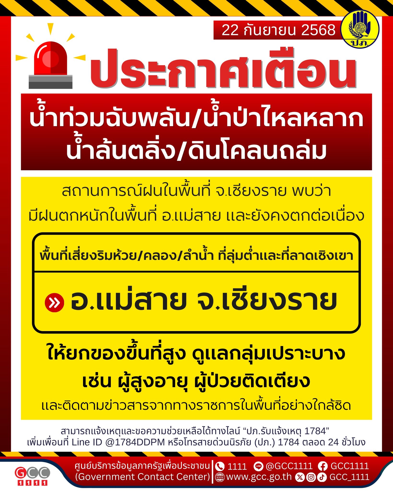 กรมป้องกันและบรรเทาสาธารณภัย (ปภ.) และจังหวัดเชียงราย ได้ติดตามสถานการณ์ฝนในพื้นที่ จ.เชียงราย พบว่ามีฝนตกหนักในพื้นที่ อ.แม่สาย และยังคงตกต่อเนื่อง ขอให้เฝ้าระวังน้ำท่วมฉับพลัน น้ำป่าไหลหลาก น้ำล้นตลิ่ง ดินโคลนถล่ม ในพื้นที่เสี่ยงริมห้วย/คลอง/ลำน้ำ ที่ลุ่มต่ำและที่ลาดเชิงเขา ให้ยกของขึ้นที่สูง ดูแลกลุ่มเปราะบาง เช่น ผู้สูงอายุ ผู้ป่วยติดเตียง และติดตามข่าวสารจากทางราชการในพื้นที่อย่างใกล้ชิด